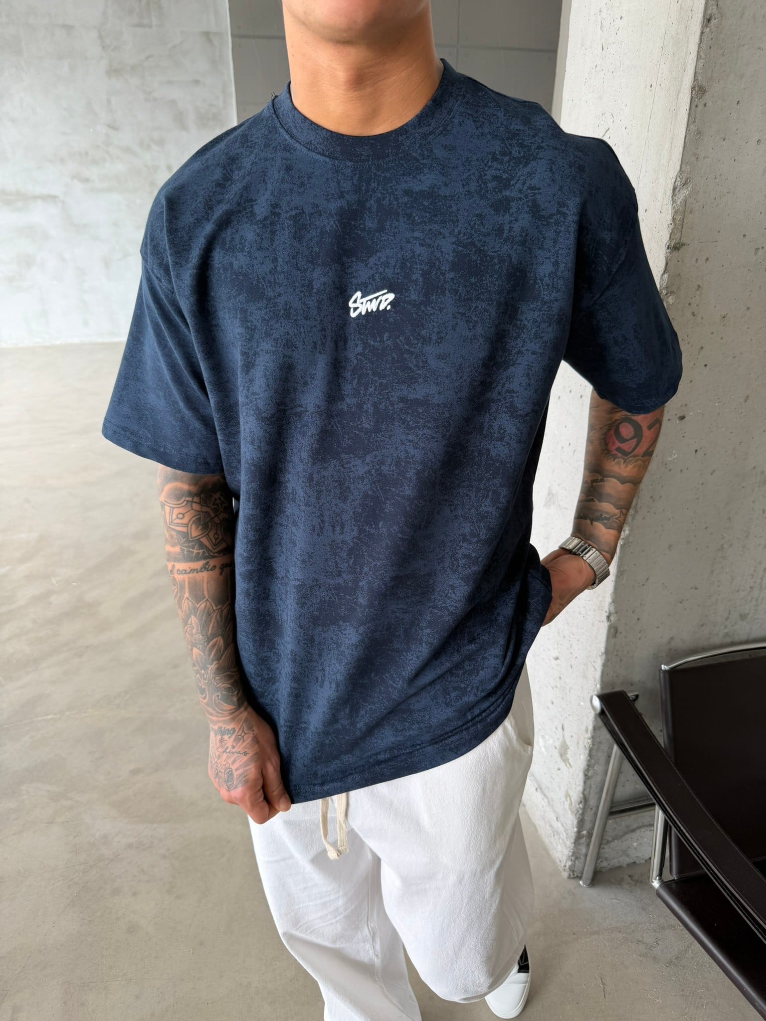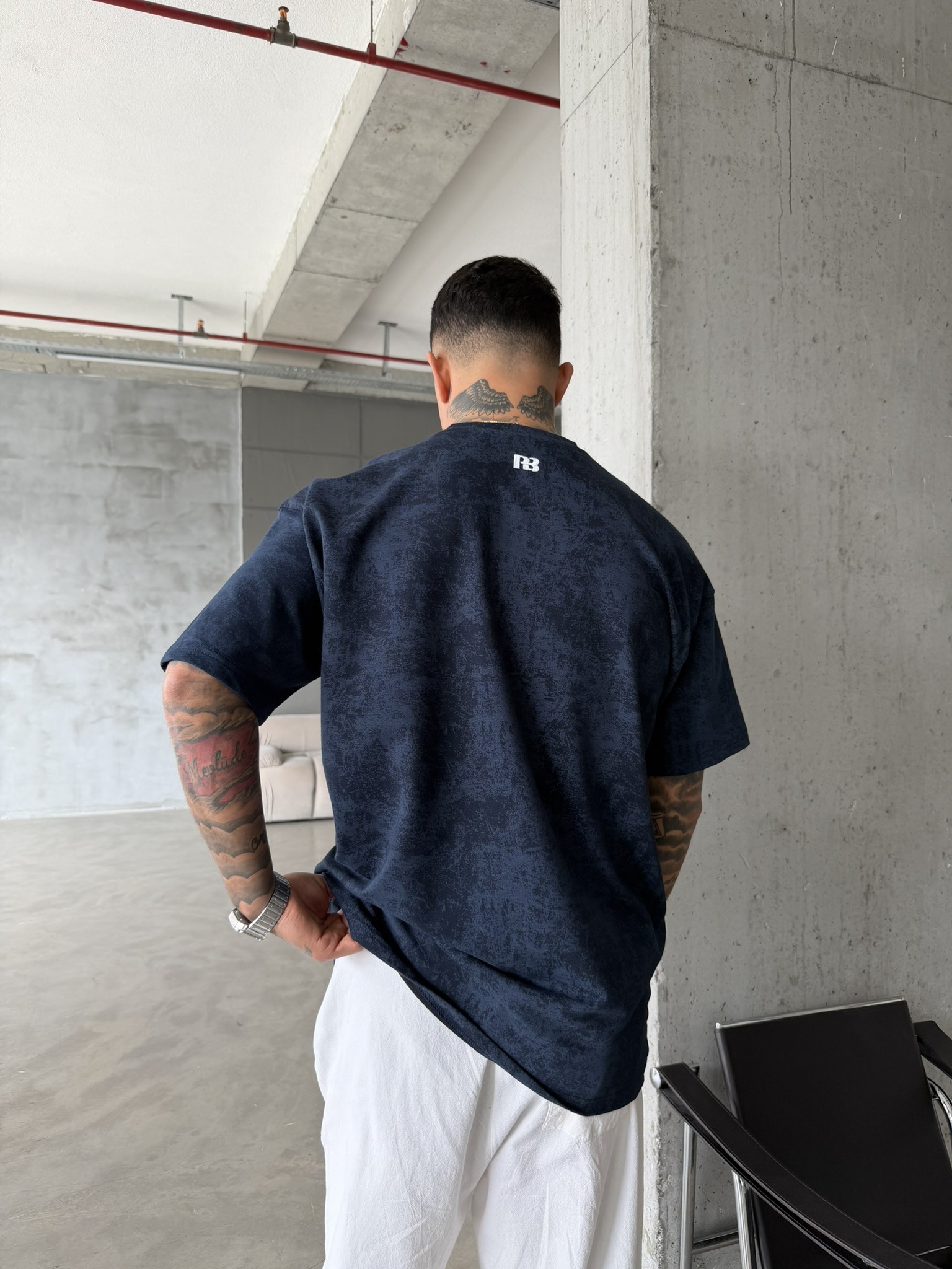 Basic Acid Yıkamalı P&B Nakış T-Shirt - İndigo (TST.0138-İndigo-S)