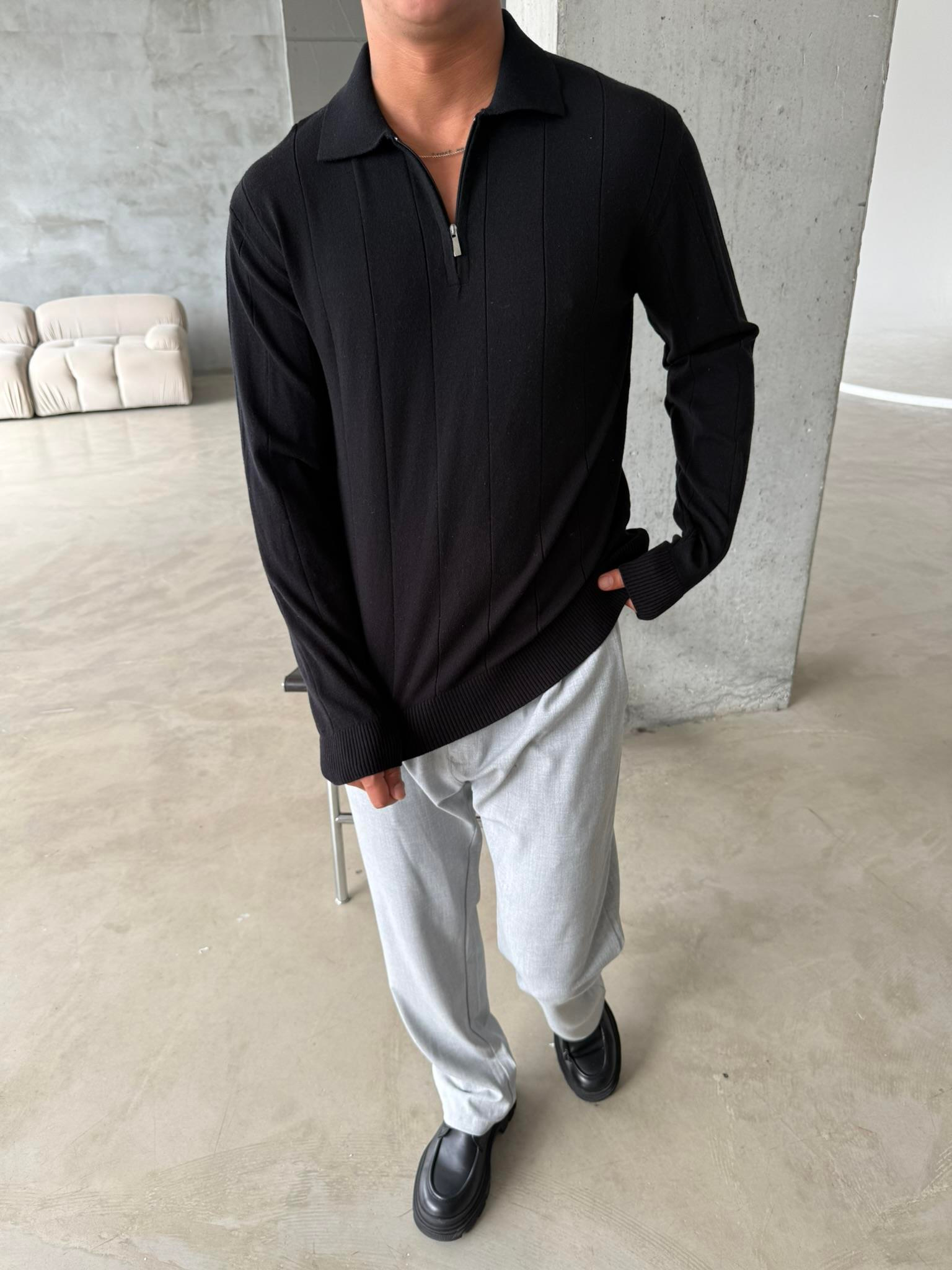 Basic Yarım Fermuar Cizgili Uzun Kol - Siyah (SWT.0028-Siyah-S)