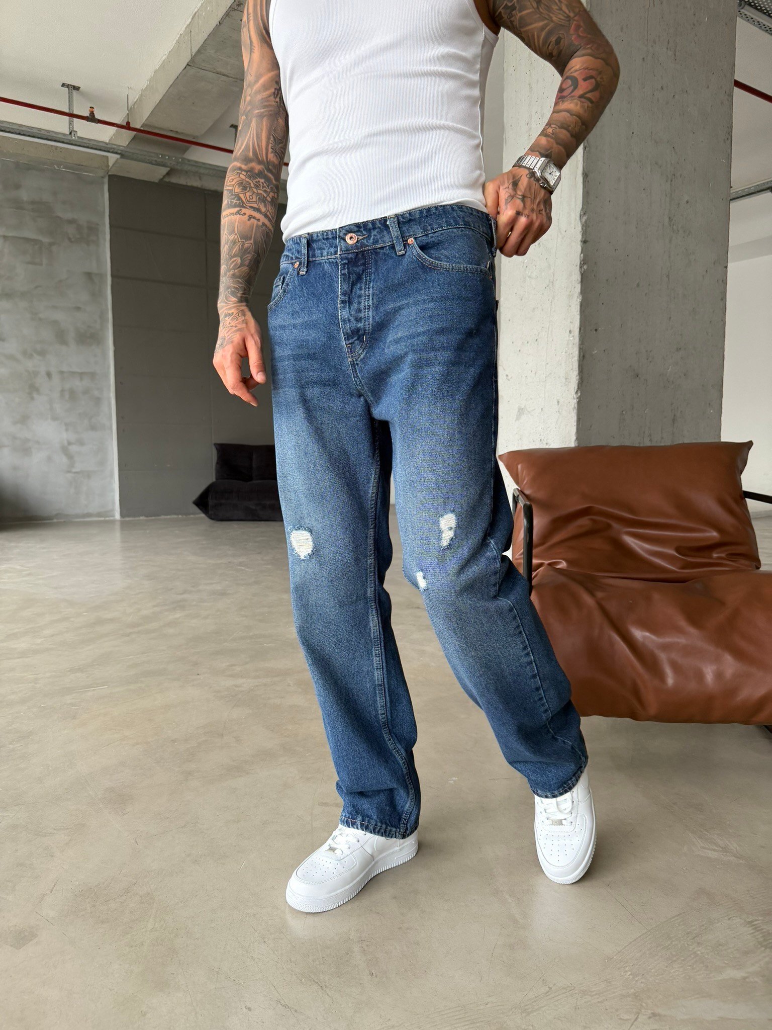 Basic Yırtık Detaylı Baggy Pantolon - İndigo (PNT.0099-İndigo-29)