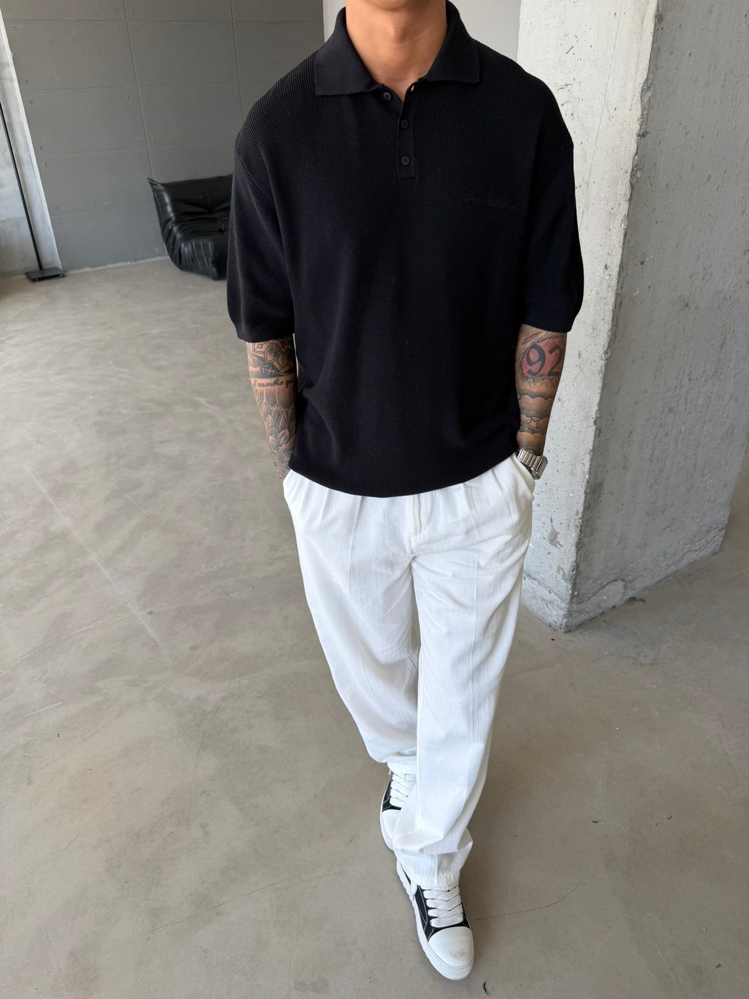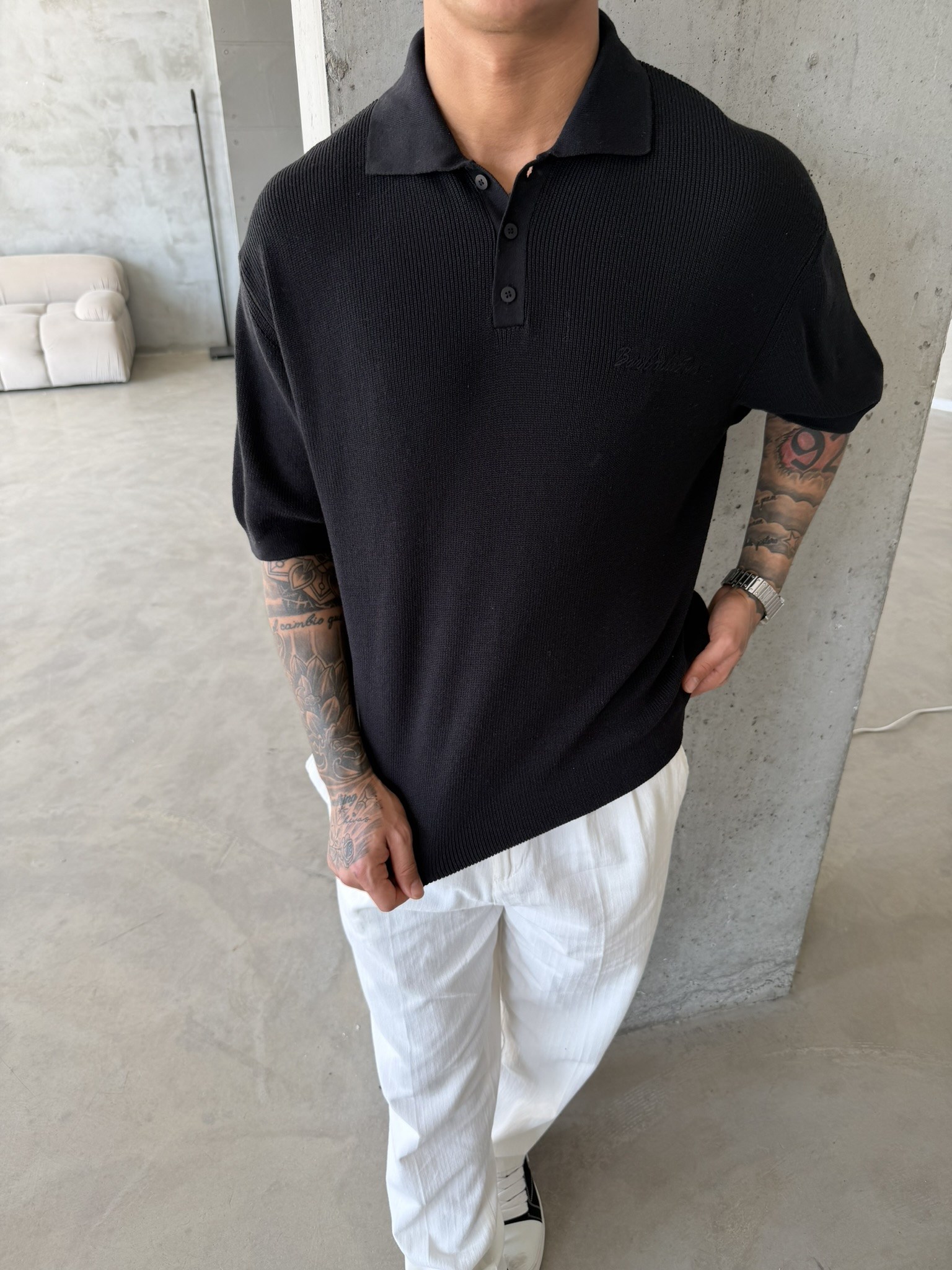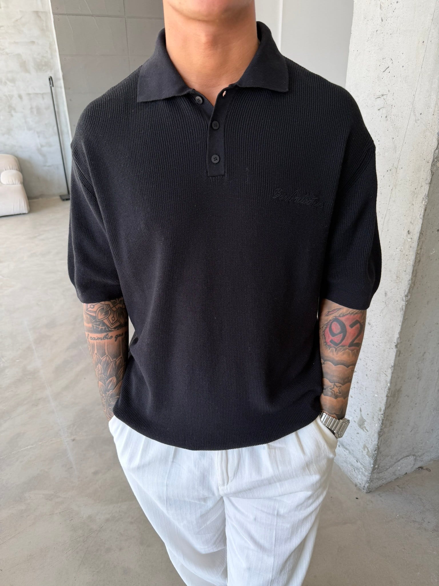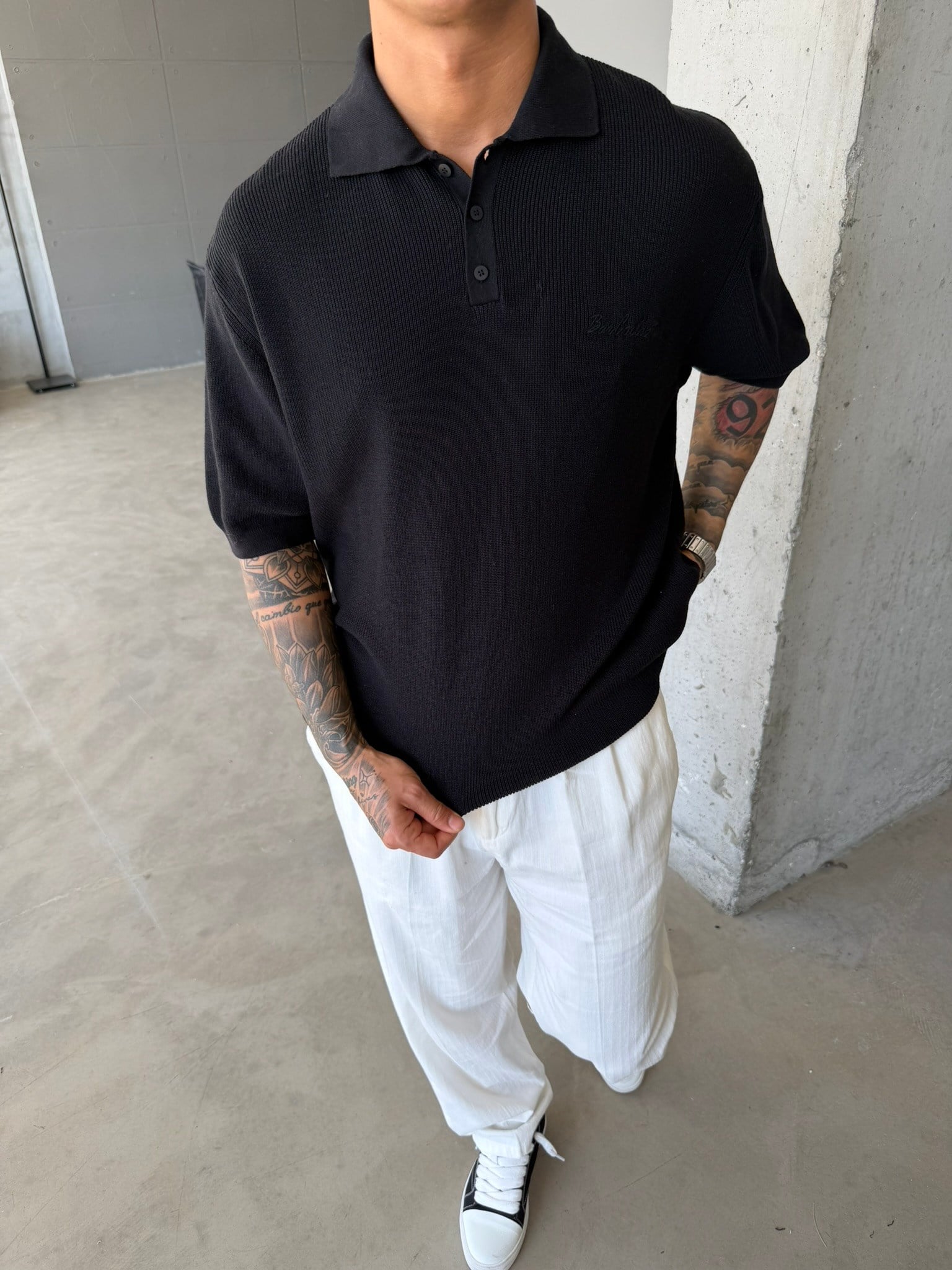 Nakışlı Dokulu Örme Polo T-Shirt - Siyah (TST.0176-Siyah-S)