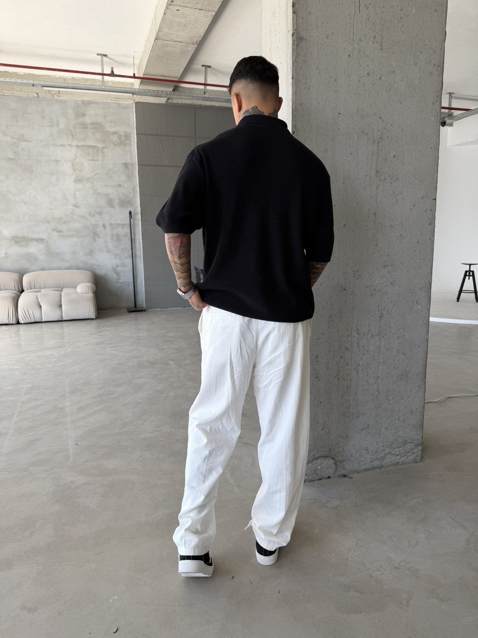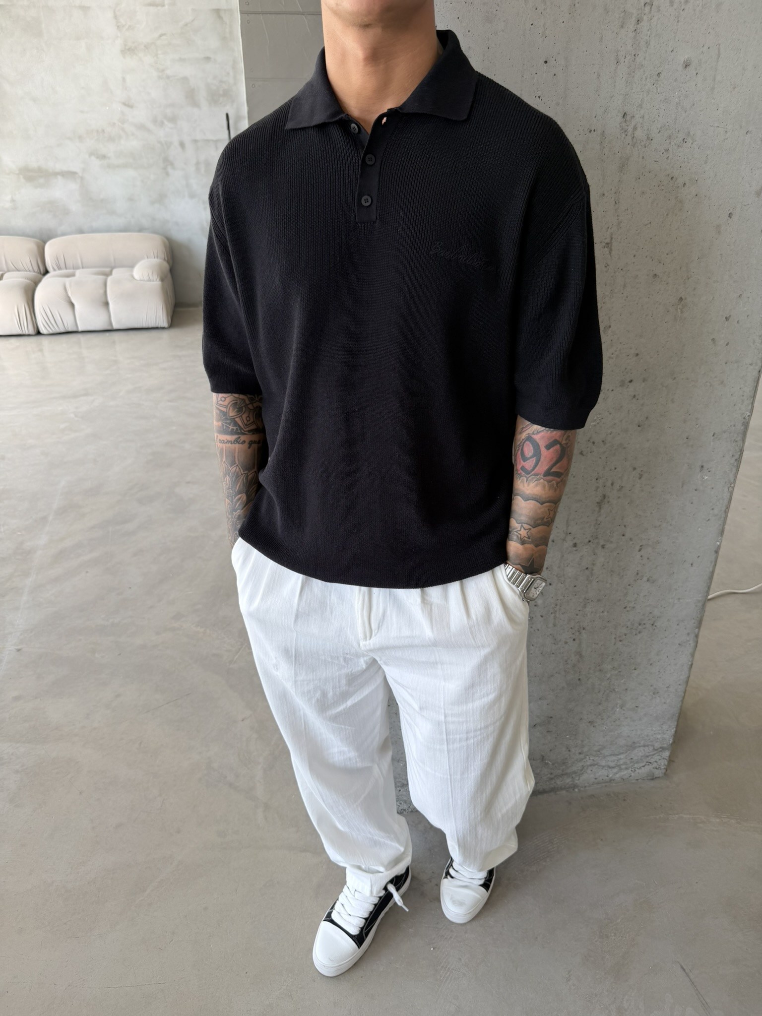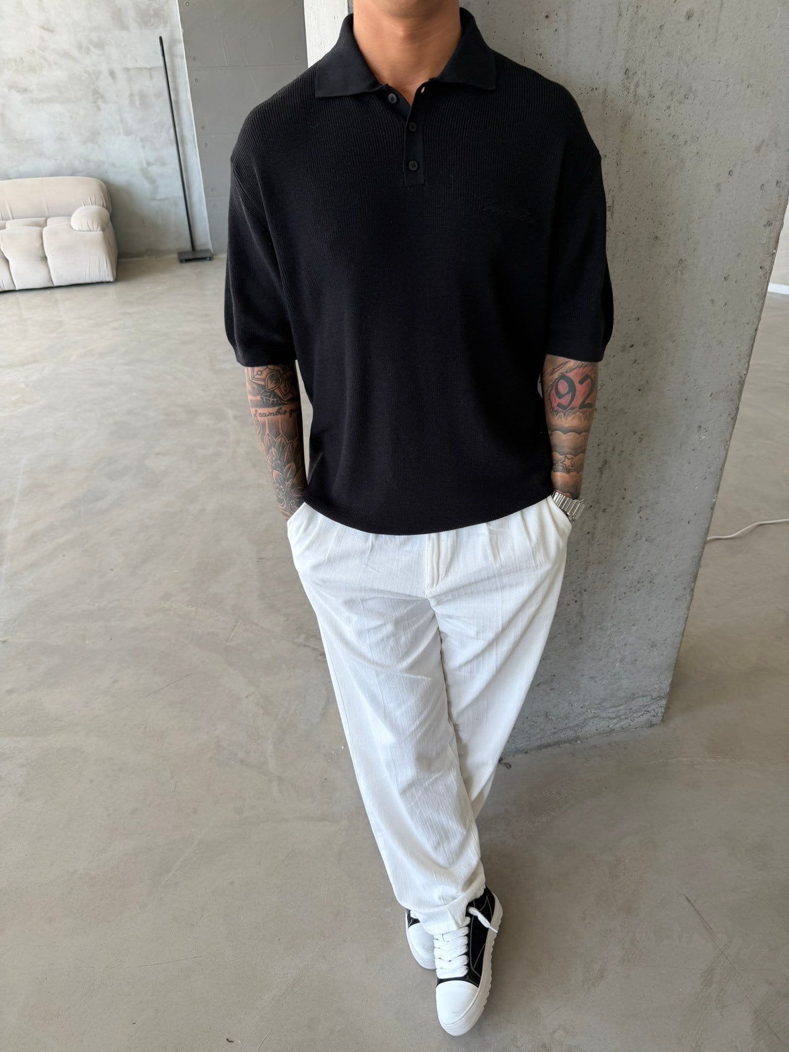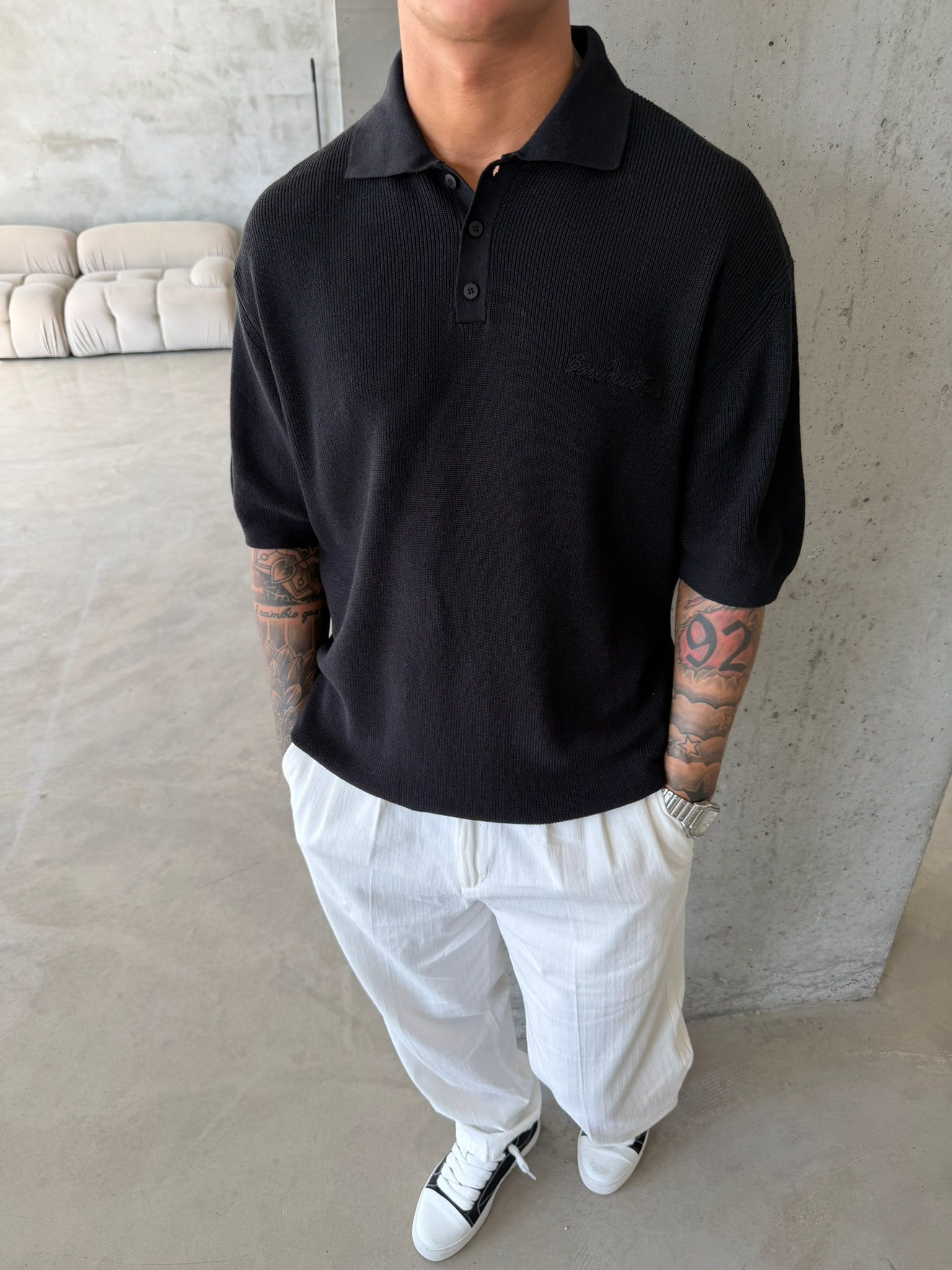 Nakışlı Dokulu Örme Polo T-Shirt - Siyah (TST.0176-Siyah-S)