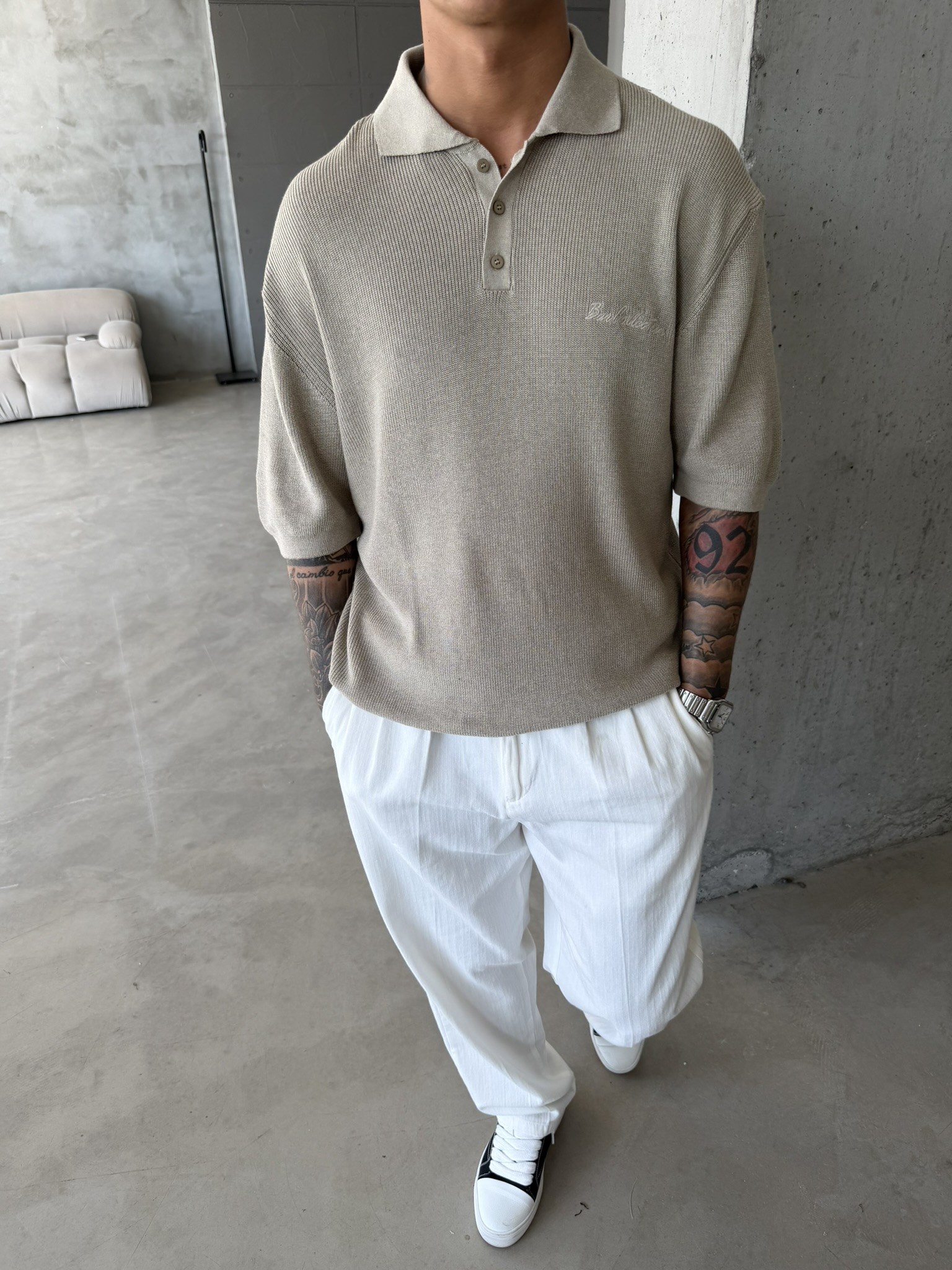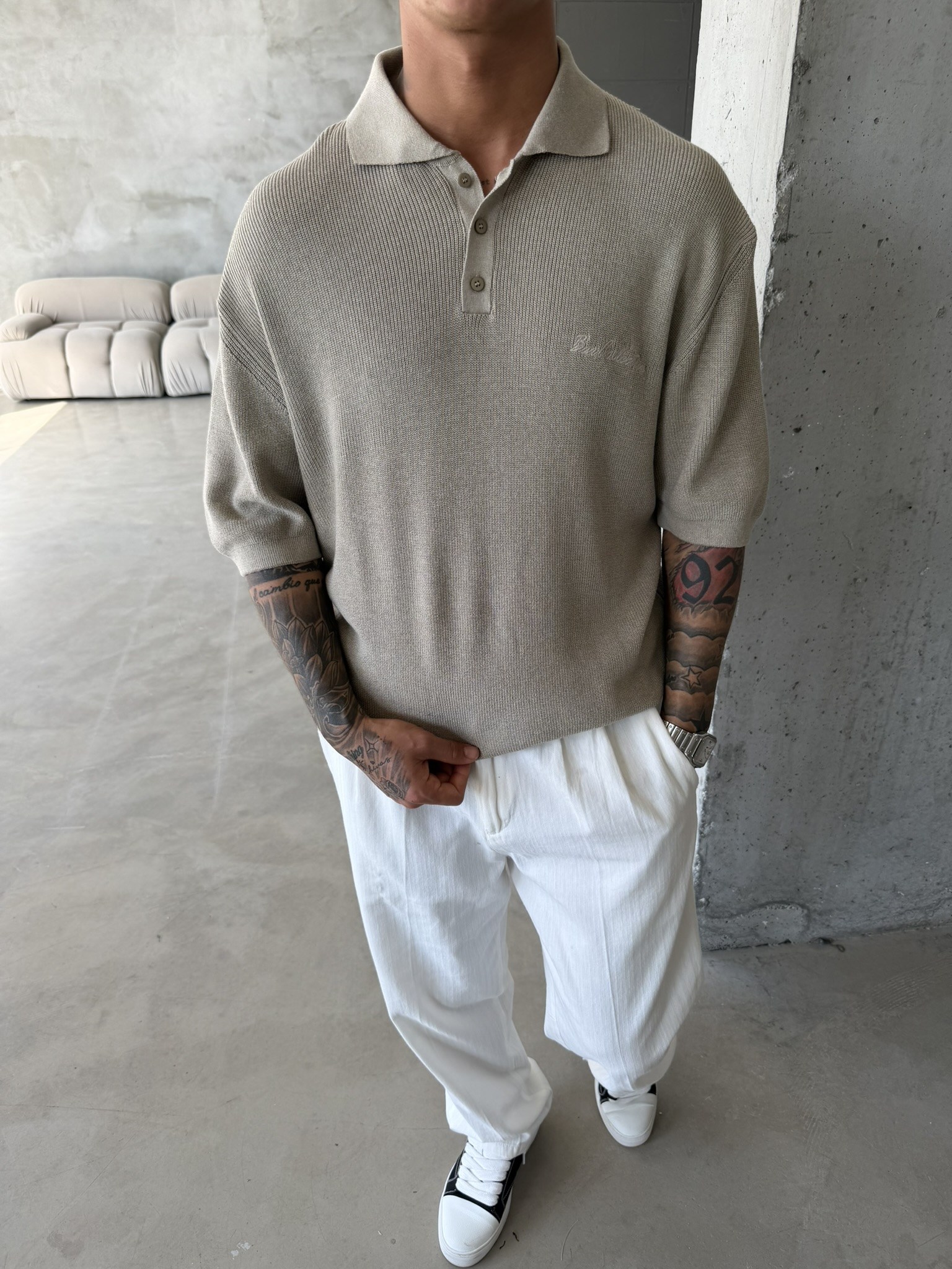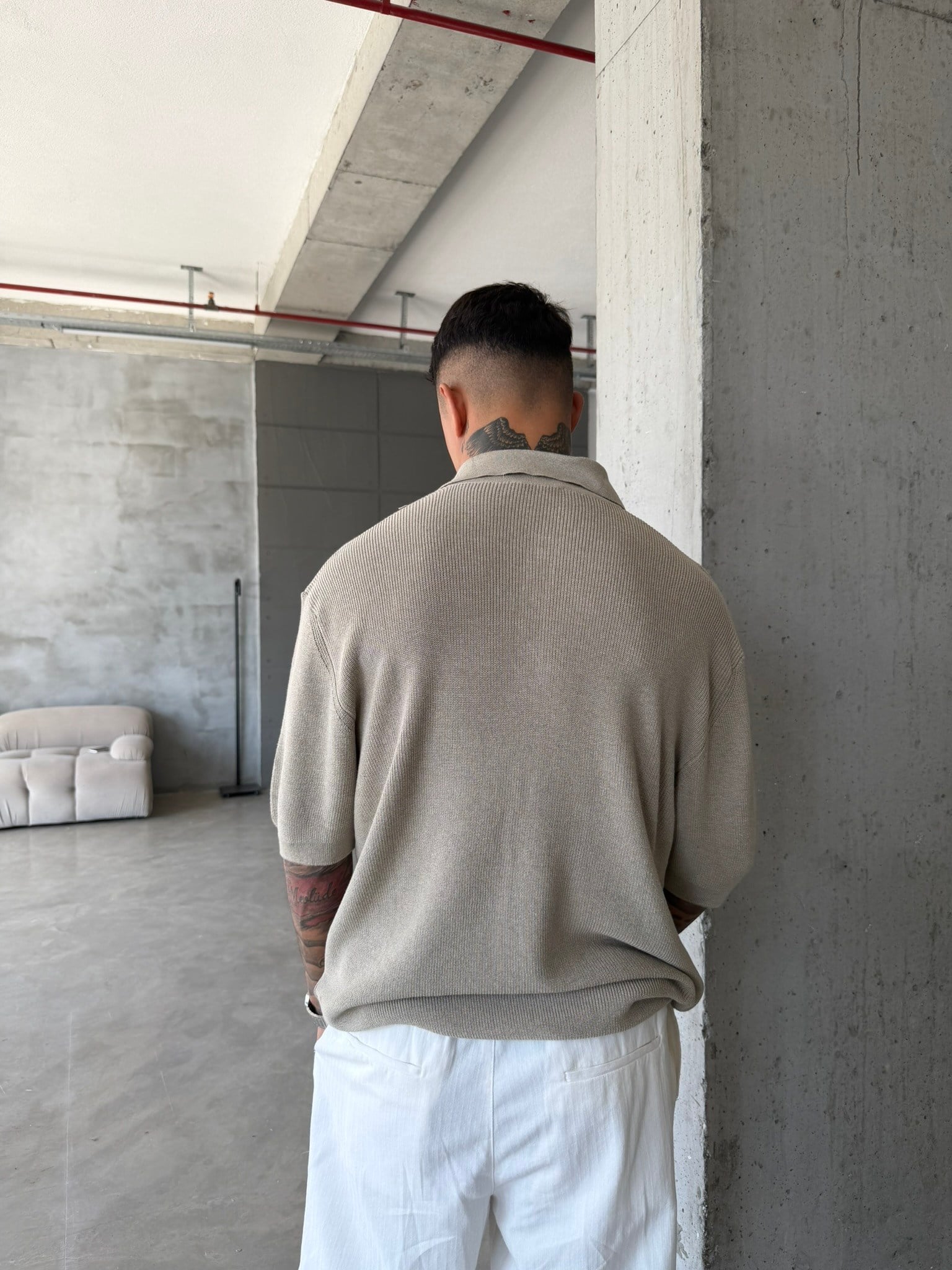 Nakışlı Dokulu Örme Polo T-Shirt - Taş (TST.0176-Taş-S)