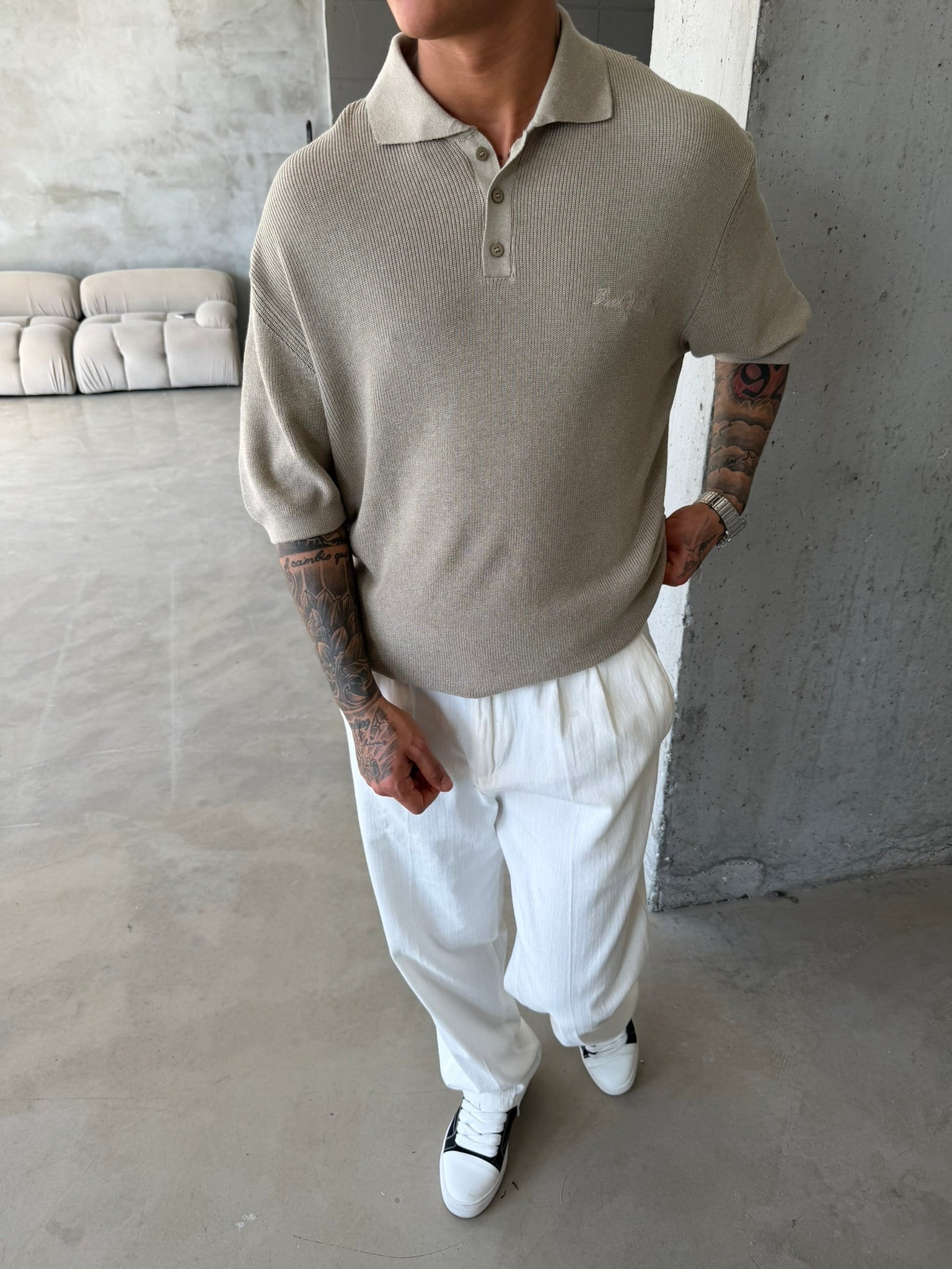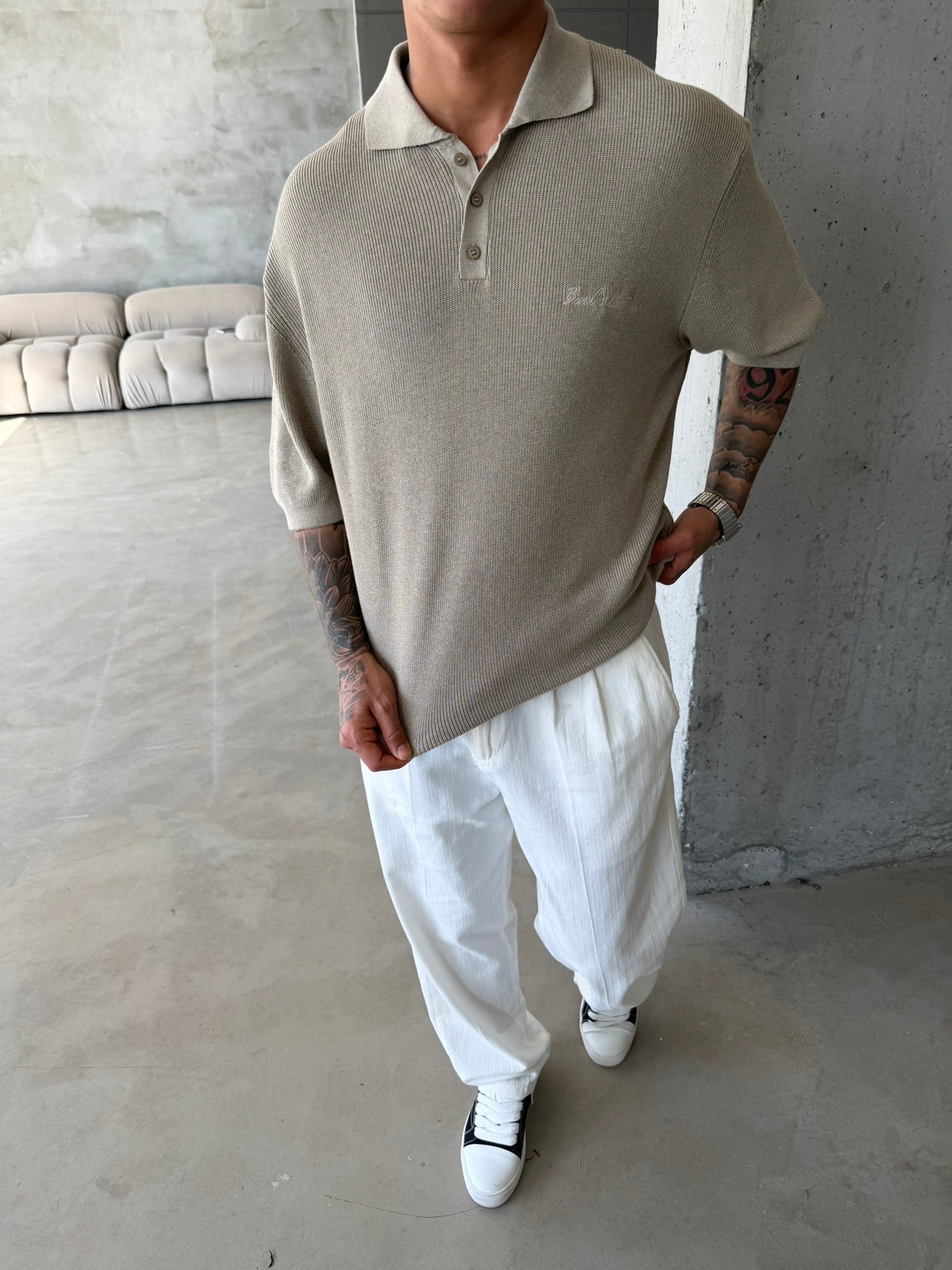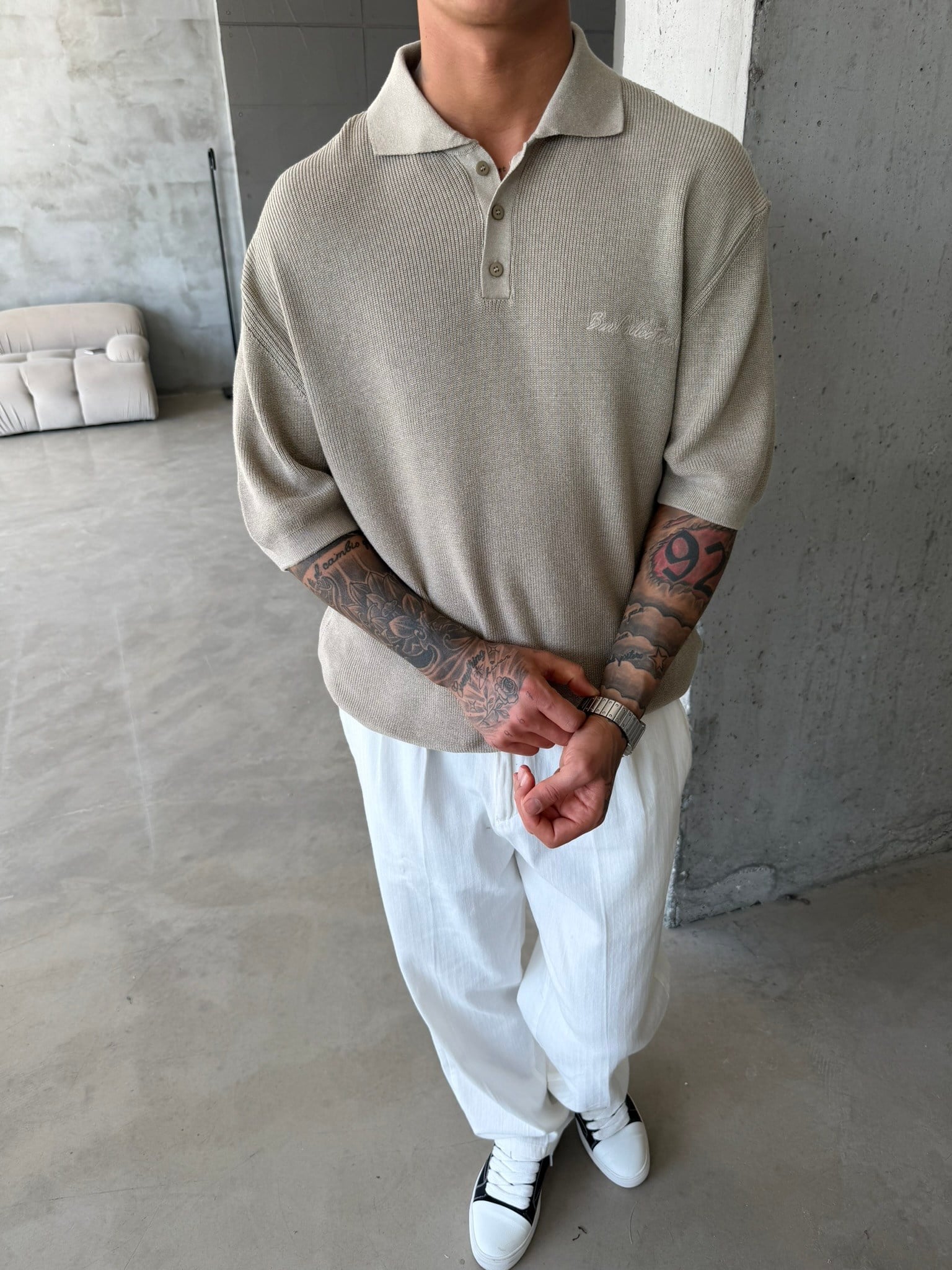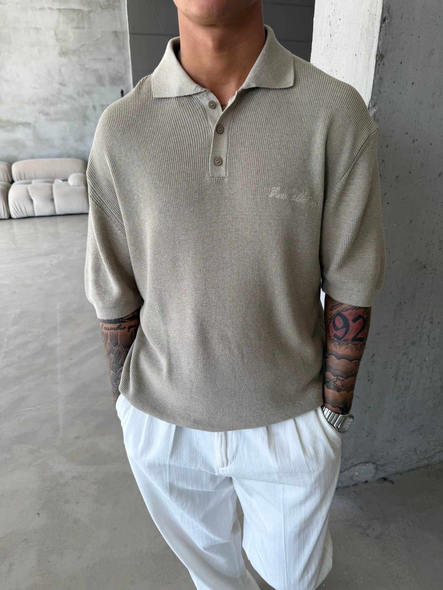 Nakışlı Dokulu Örme Polo T-Shirt - Taş (TST.0176-Taş-S)