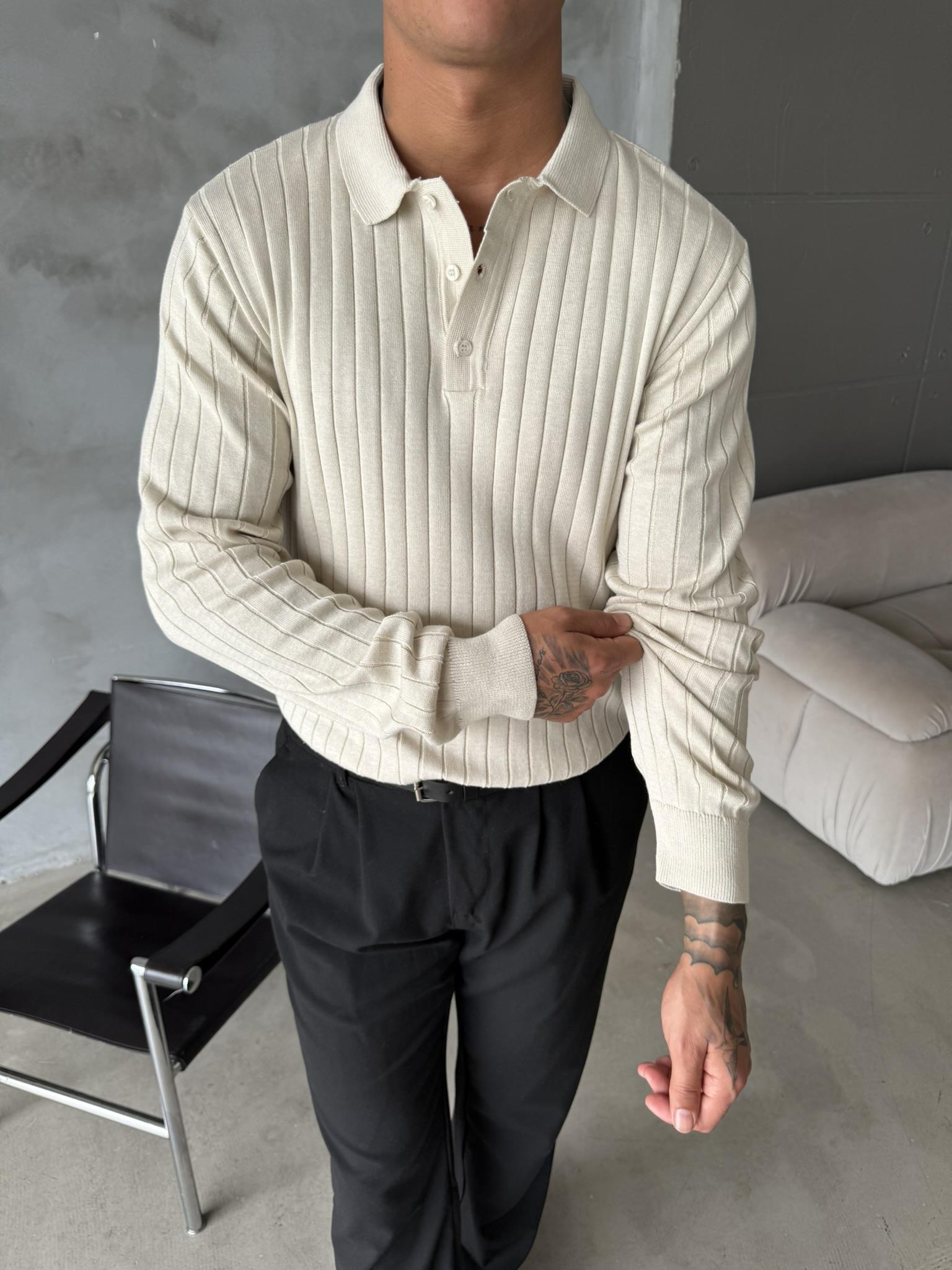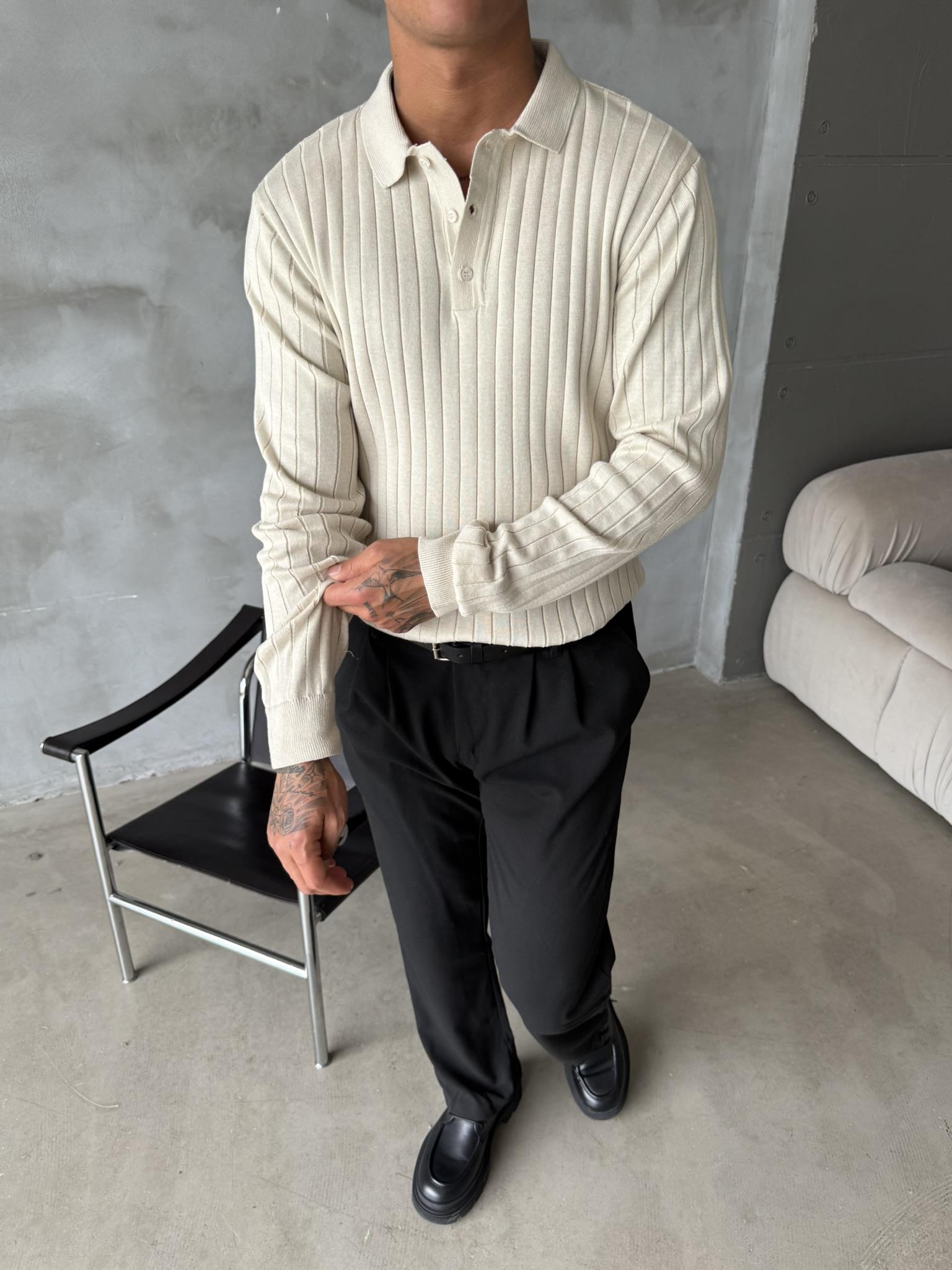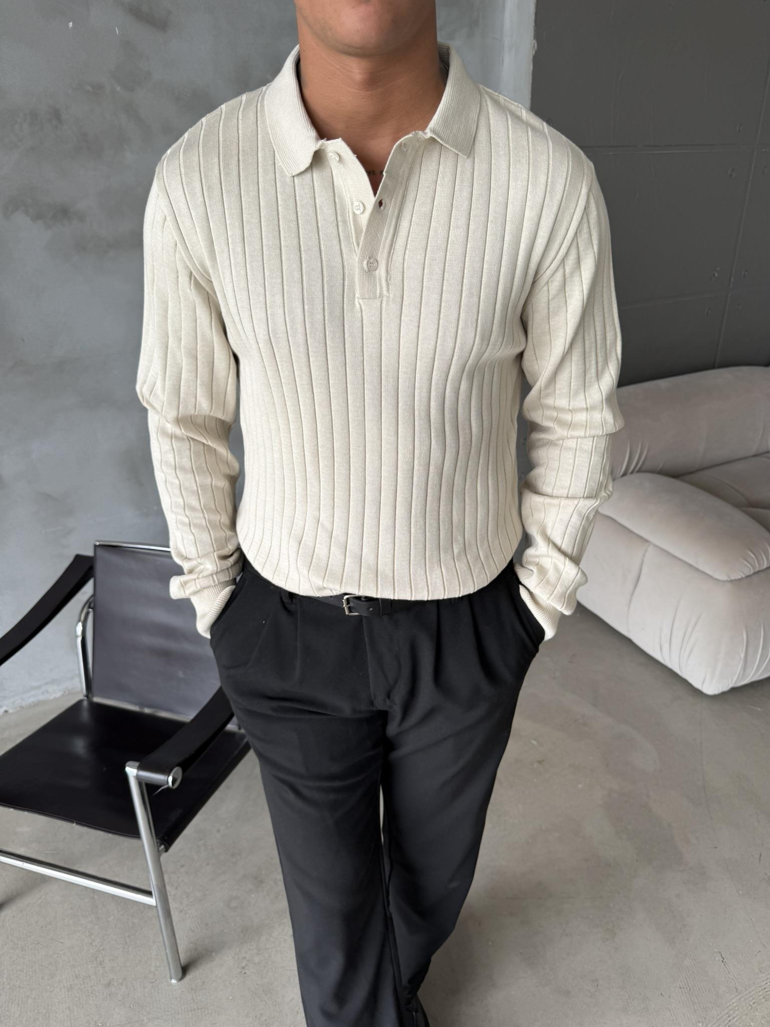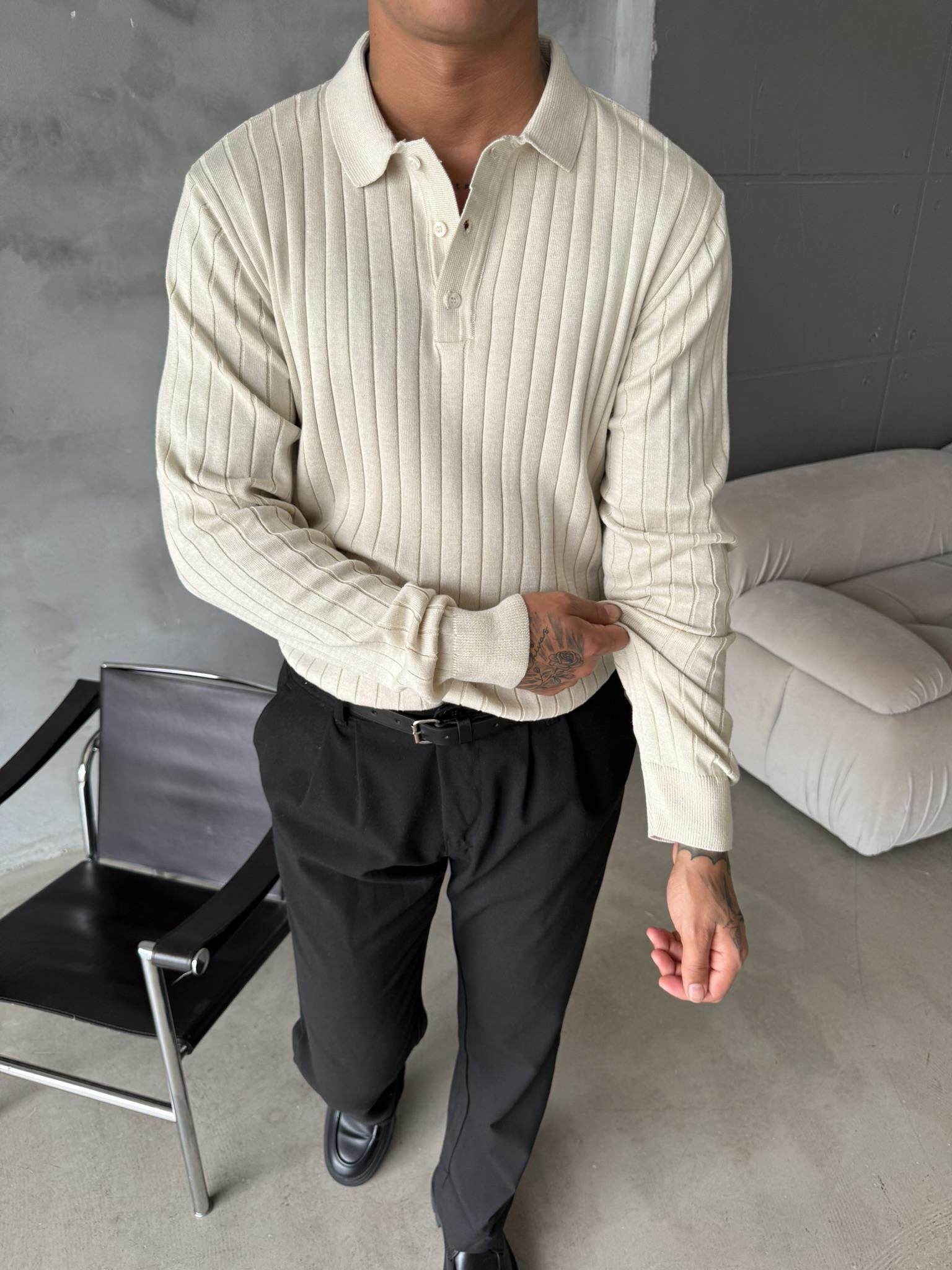 Old Money Cizgili Polo Yaka Uzun Kol - Bej (SWT.0031-Bej-S)