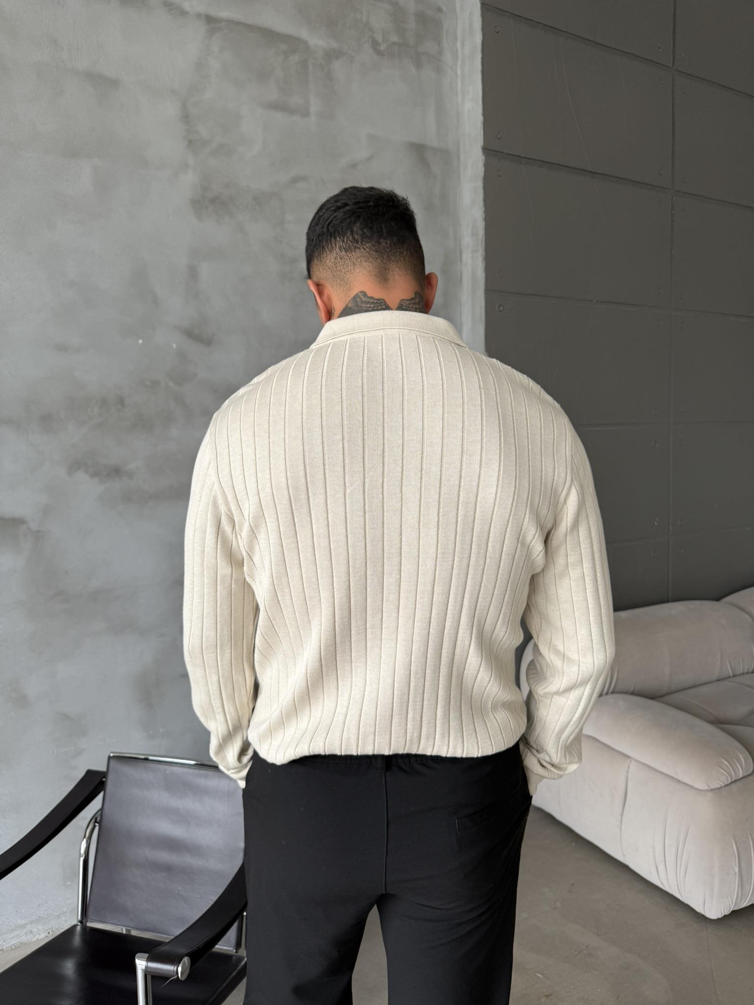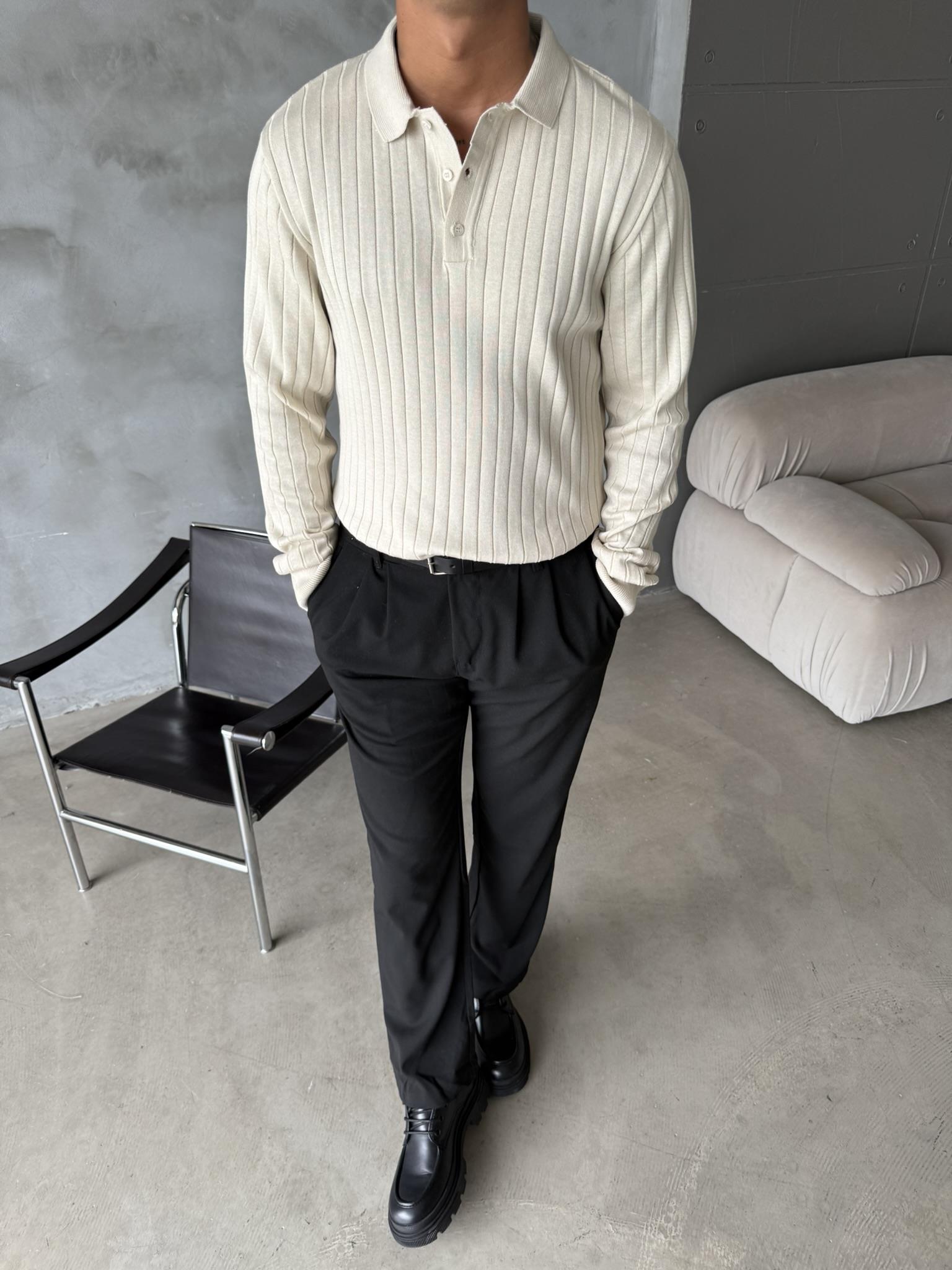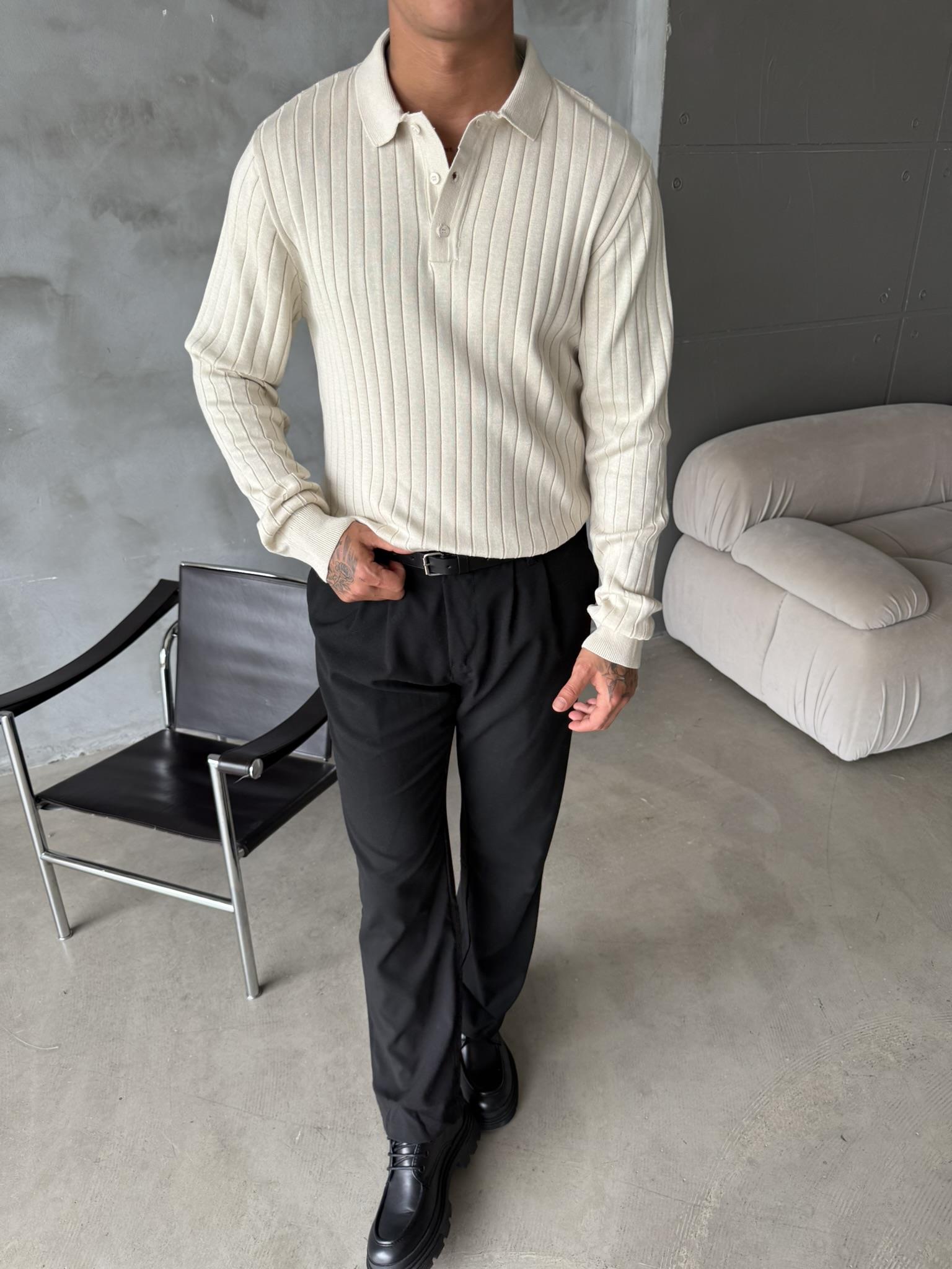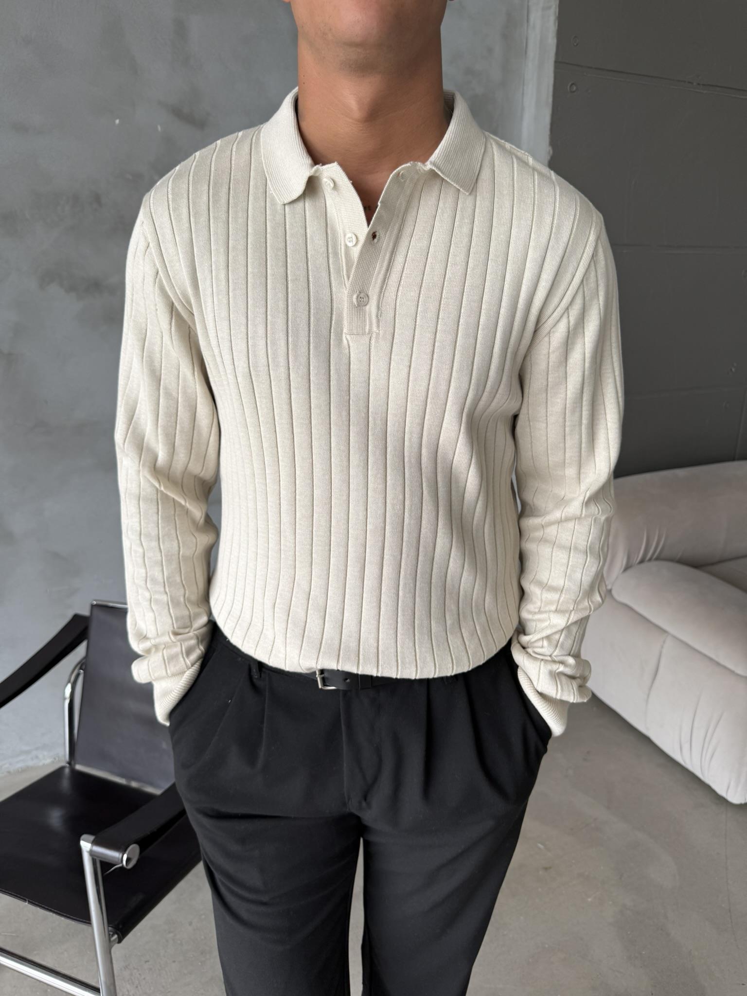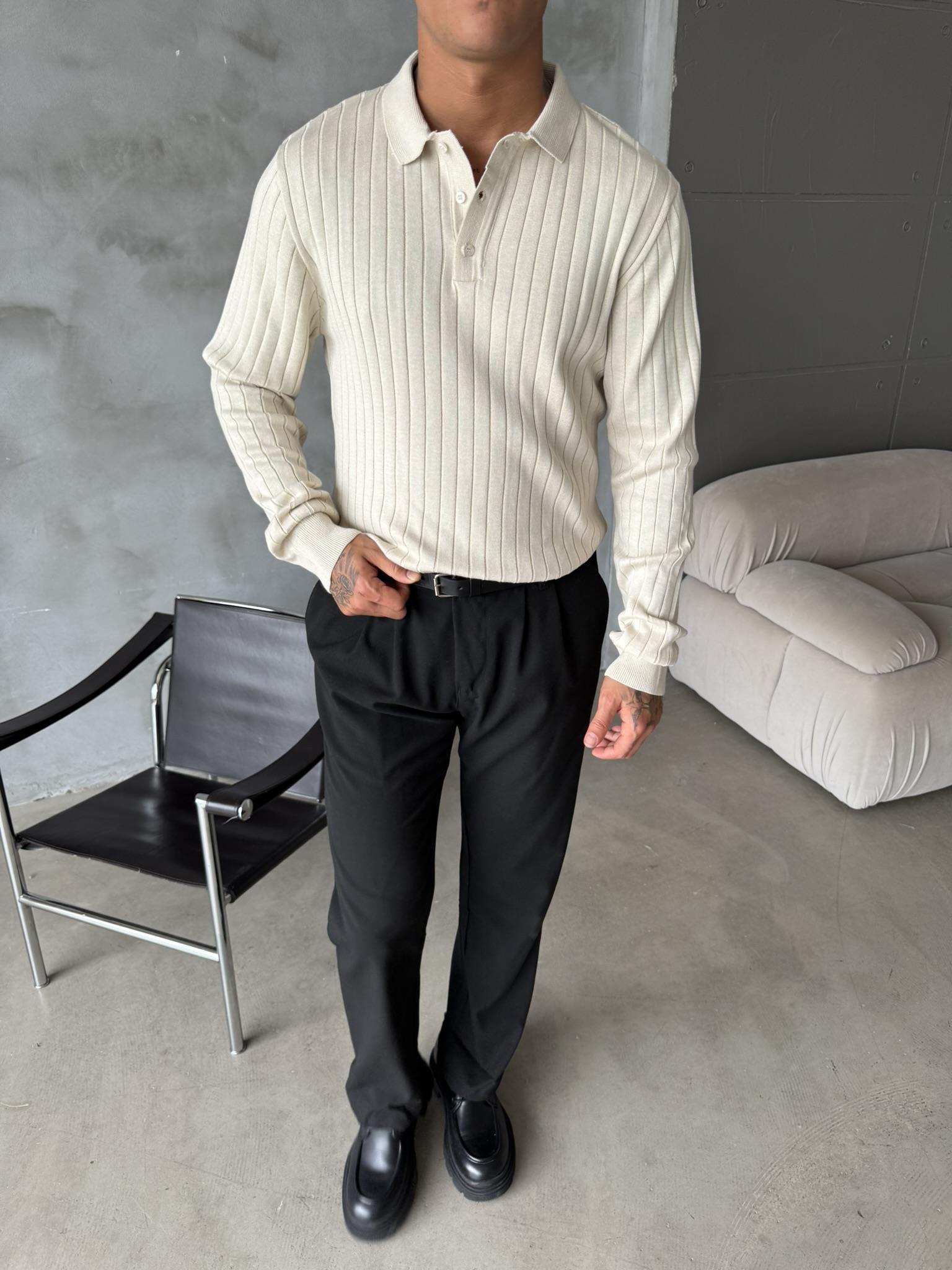 Old Money Cizgili Polo Yaka Uzun Kol - Bej (SWT.0031-Bej-S)
