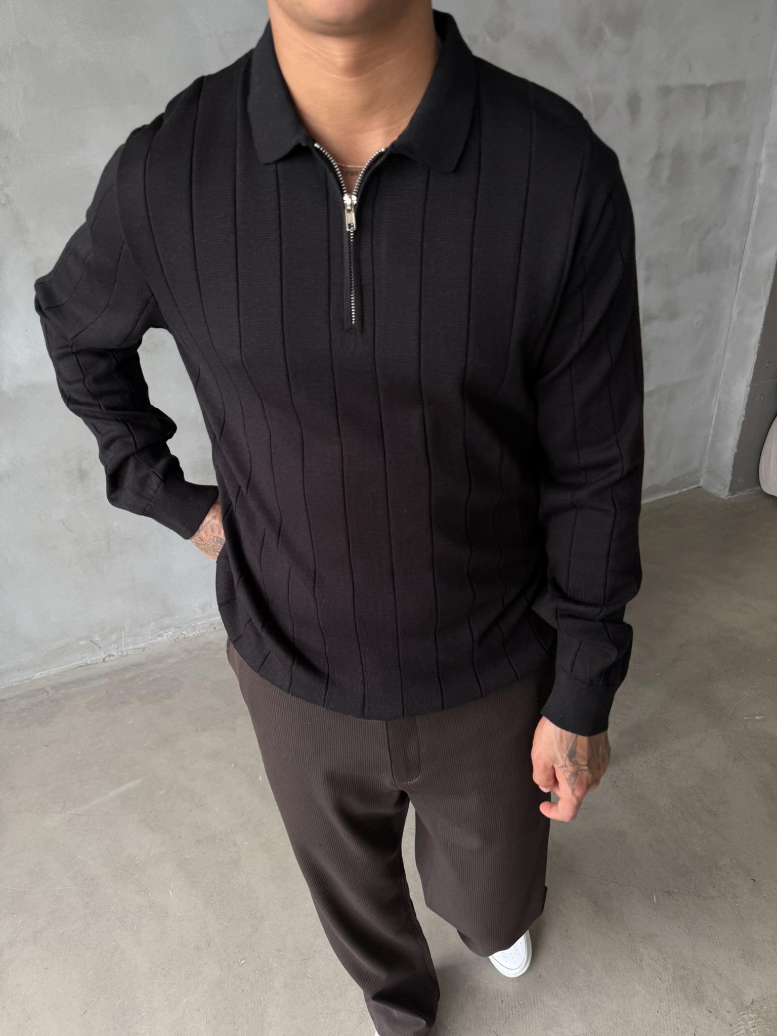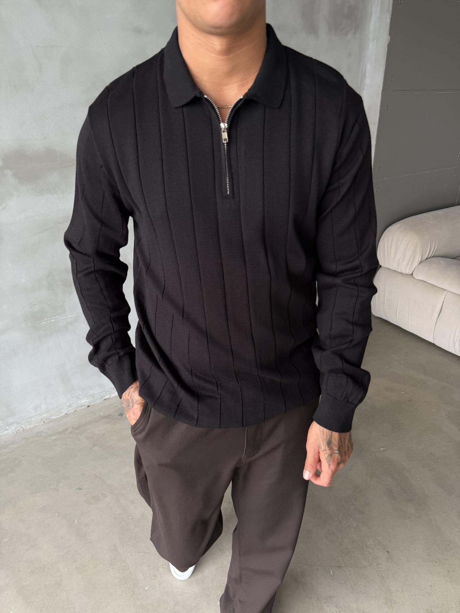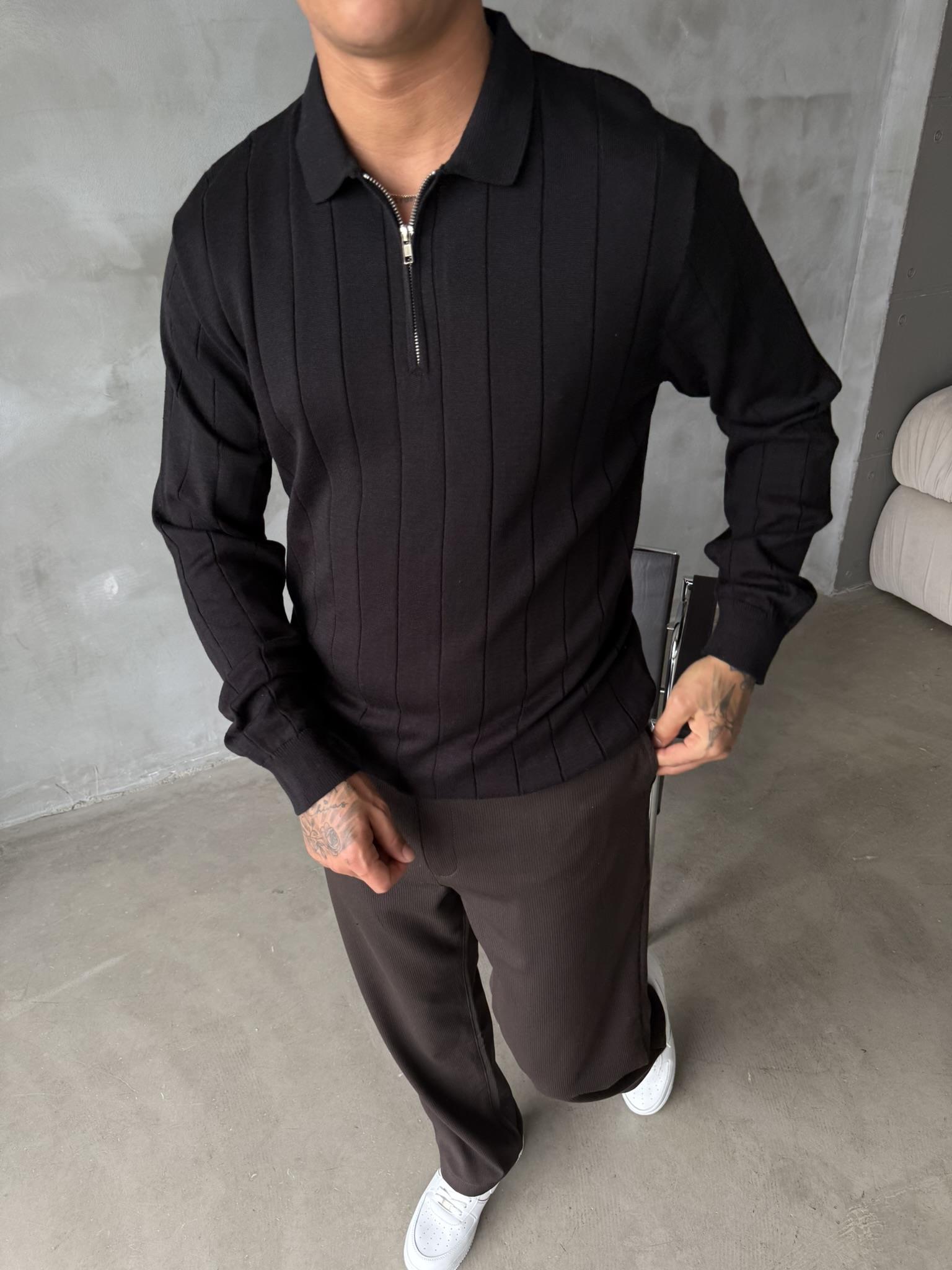Old Money Fitilli Yarım Fermuar Polo Yaka - Siyah (SWT.0032-Siyah-S)