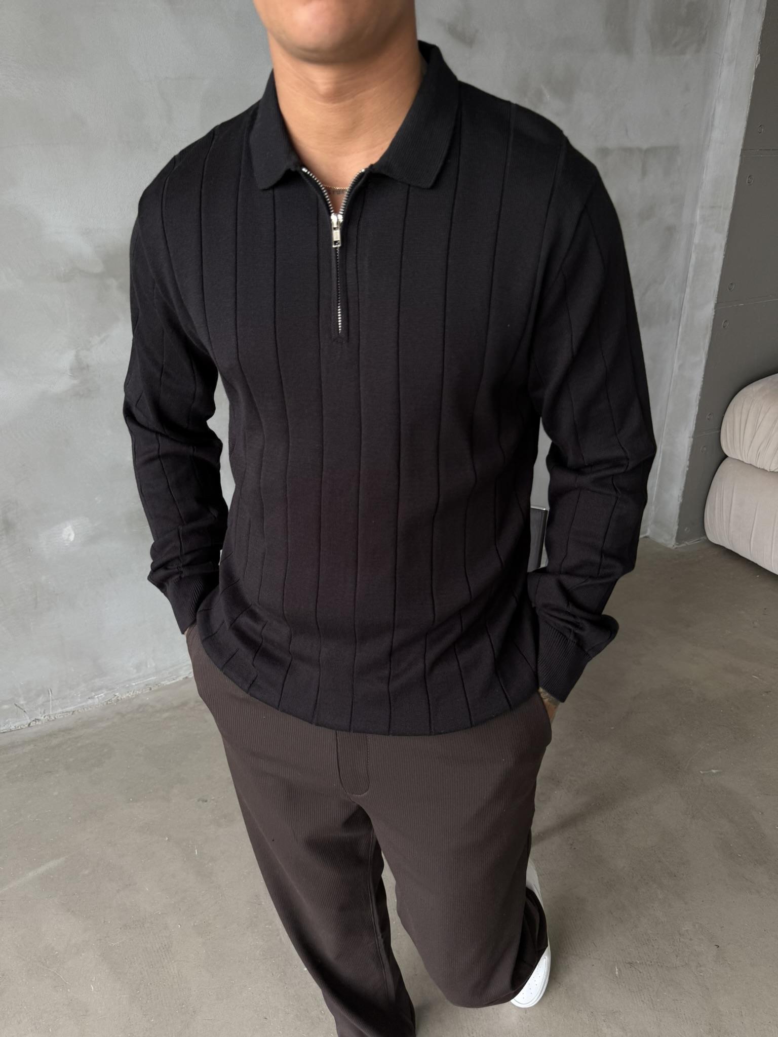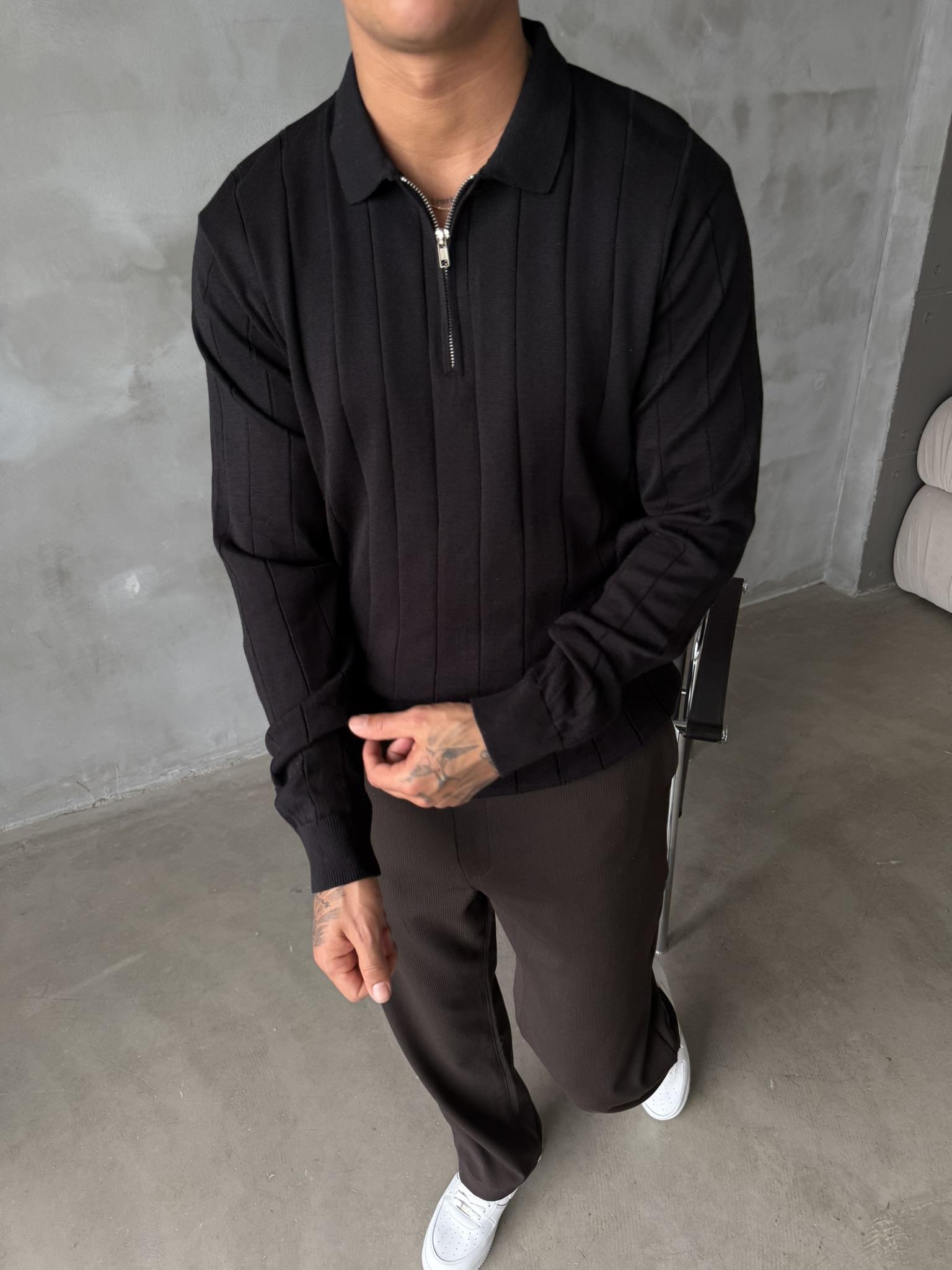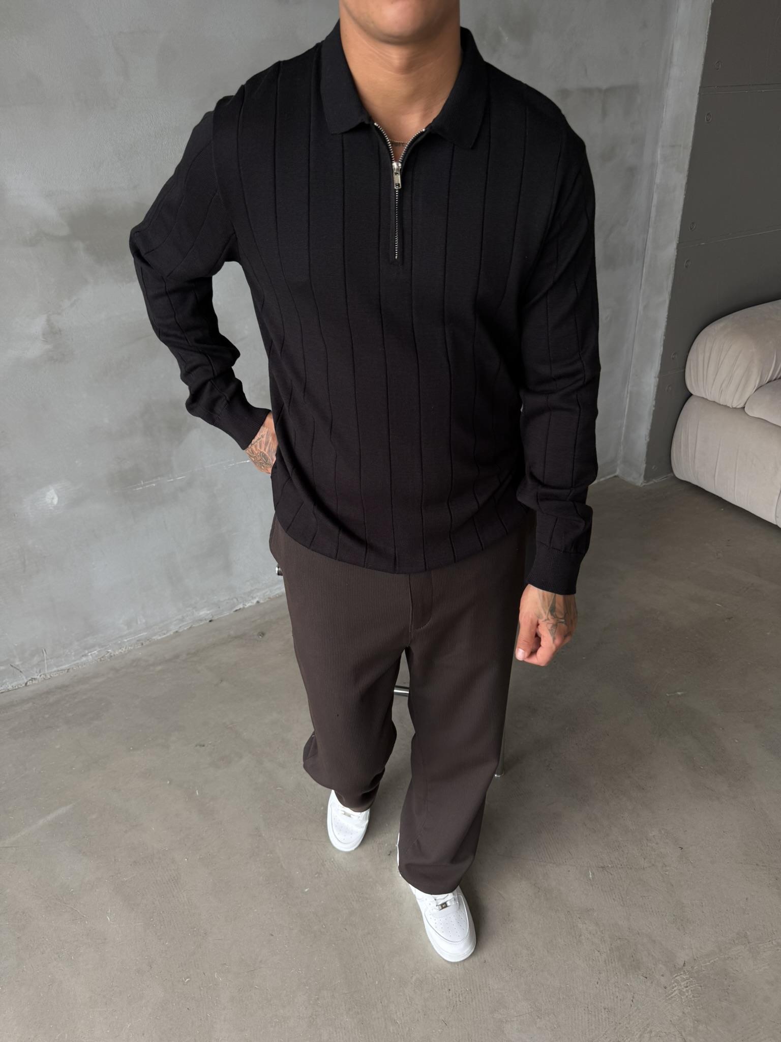 Old Money Fitilli Yarım Fermuar Polo Yaka - Siyah (SWT.0032-Siyah-S)