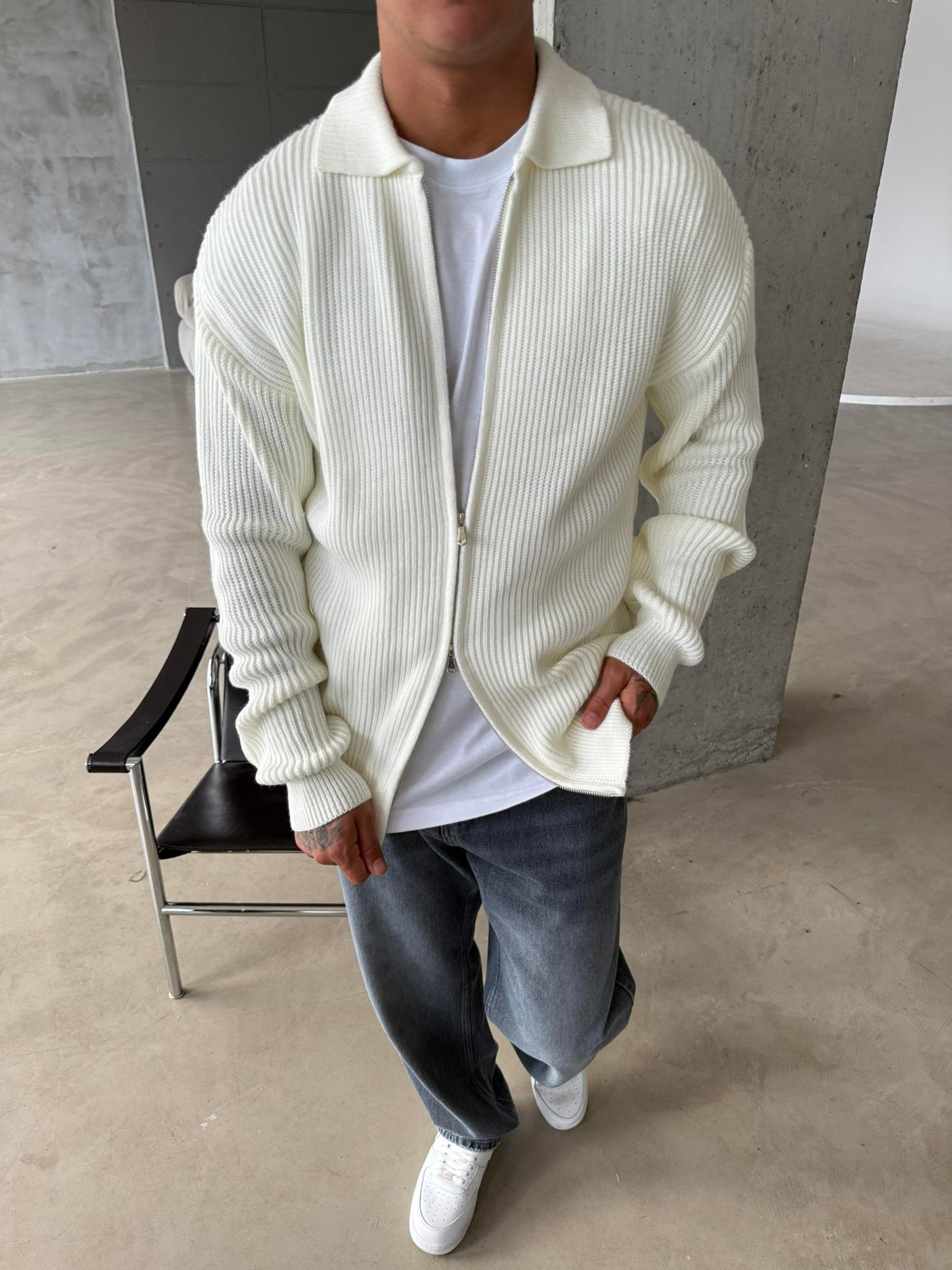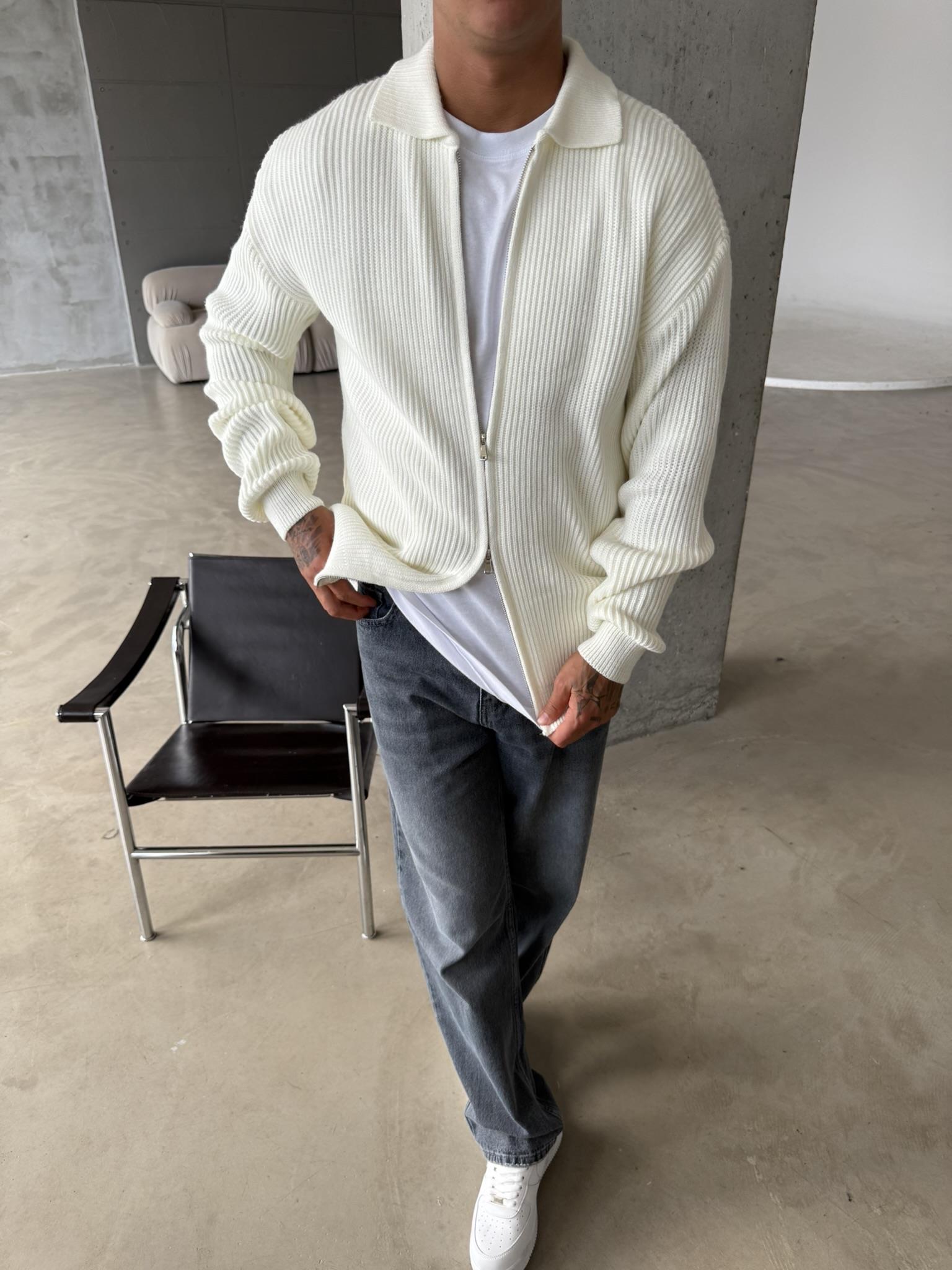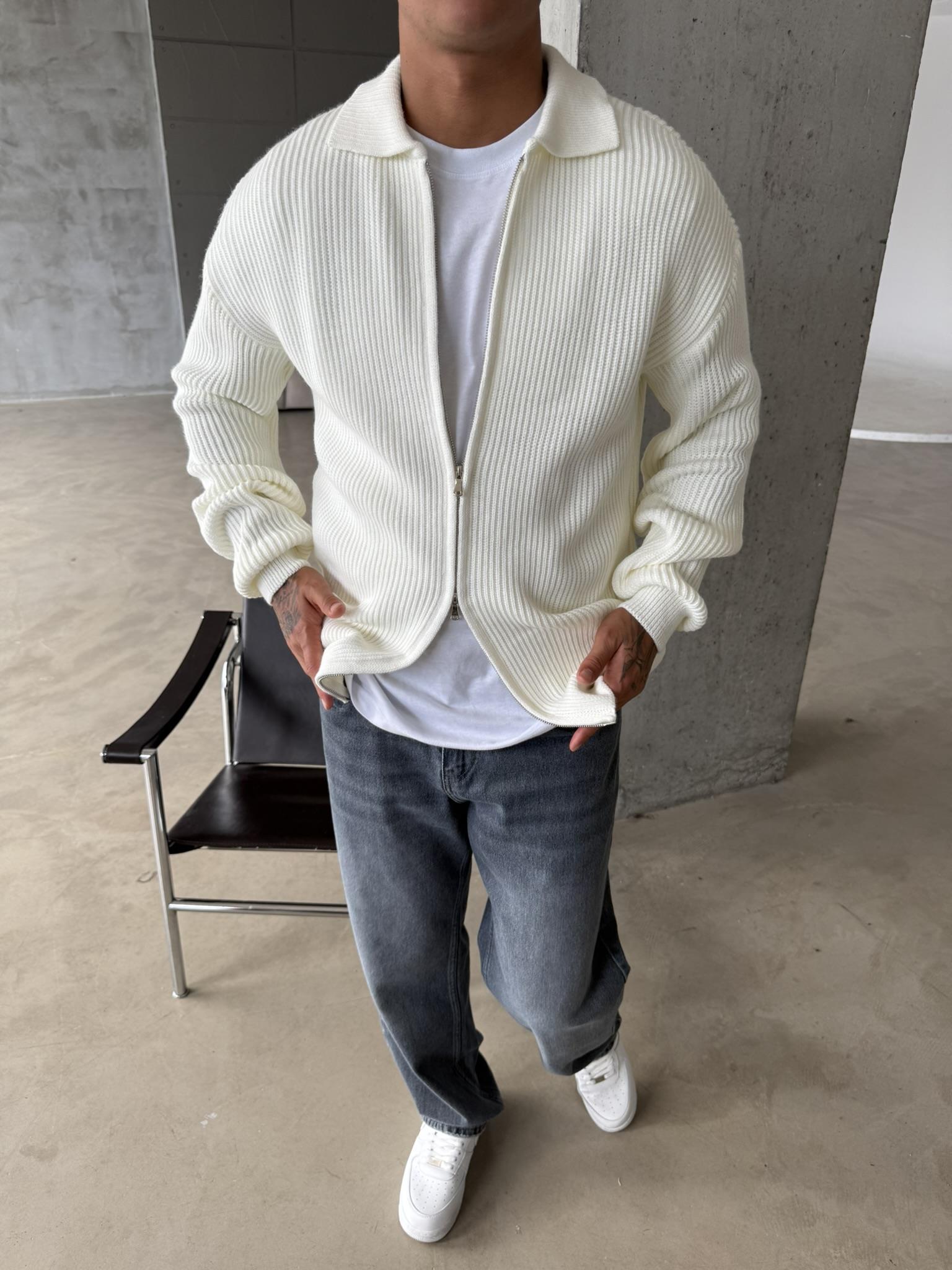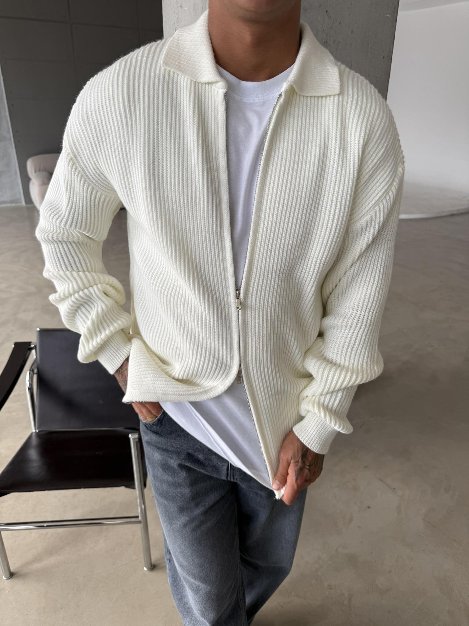 Örme Kumaş Cift Fermuar Triko Hırka - Beyaz (HRK.0003-Beyaz-S)