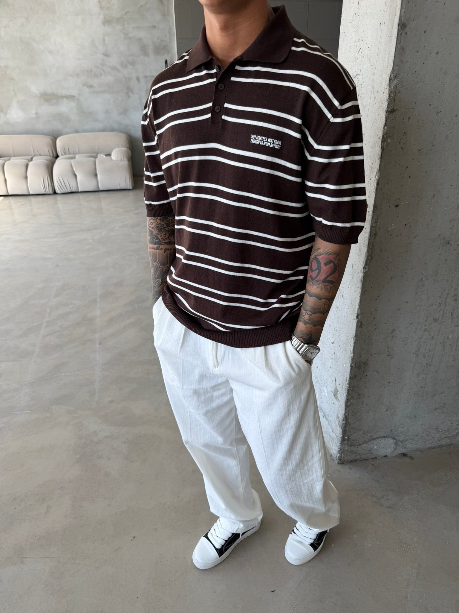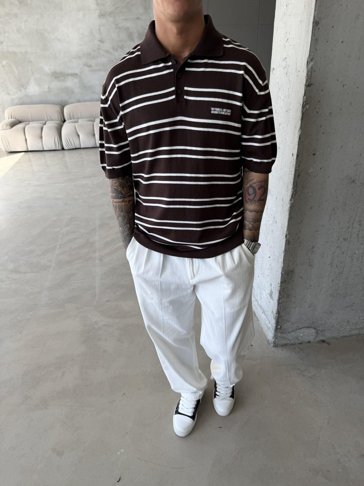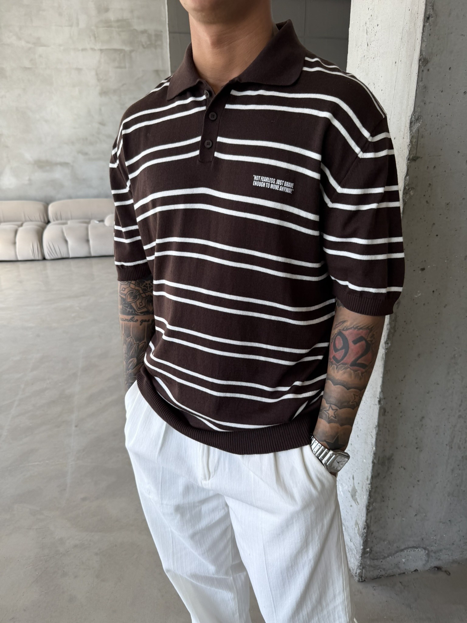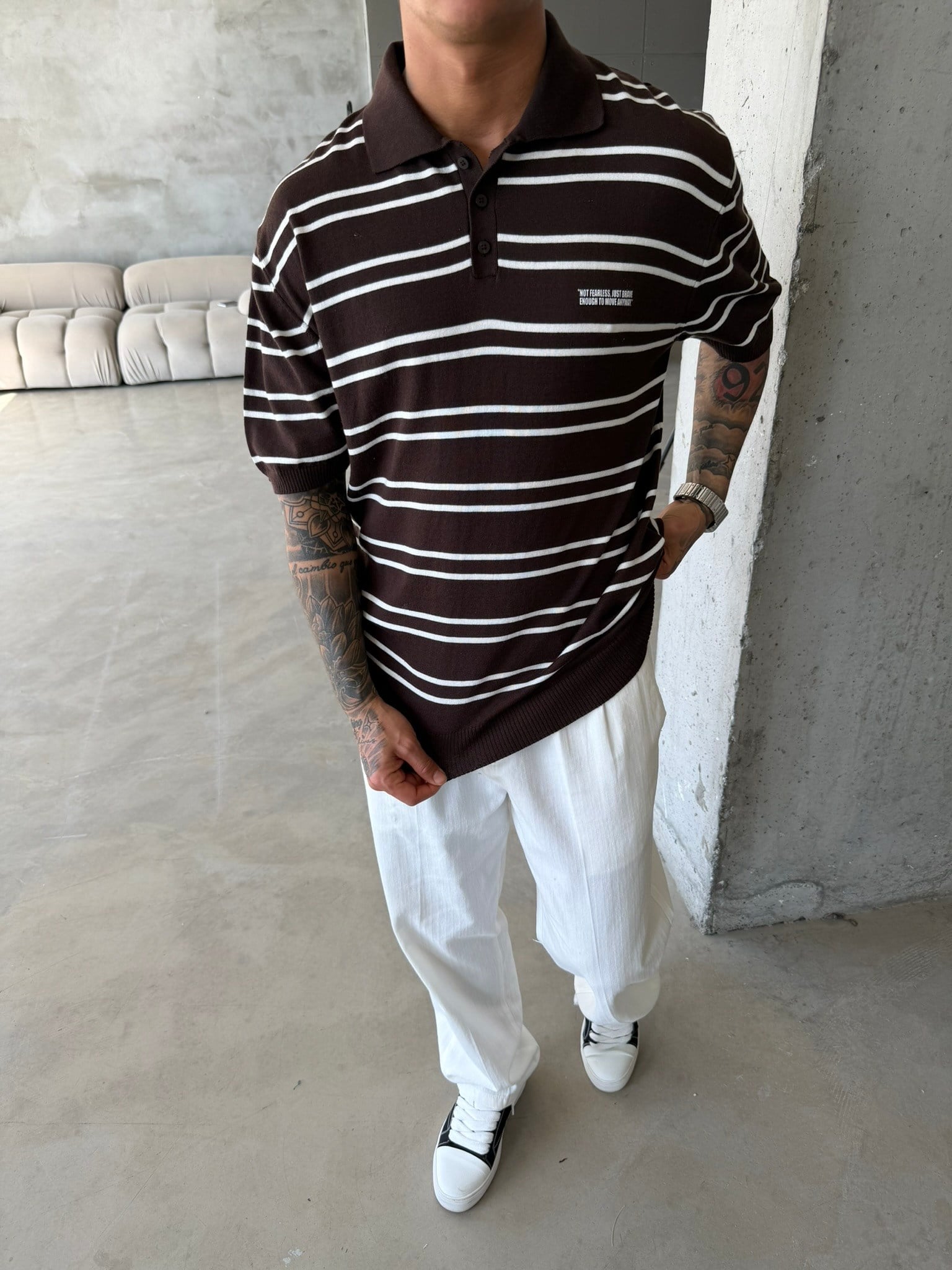 Premium Cizgili Düğmeli Yaka T-Shirt - Kahve (TST.0174-Kahve-S)