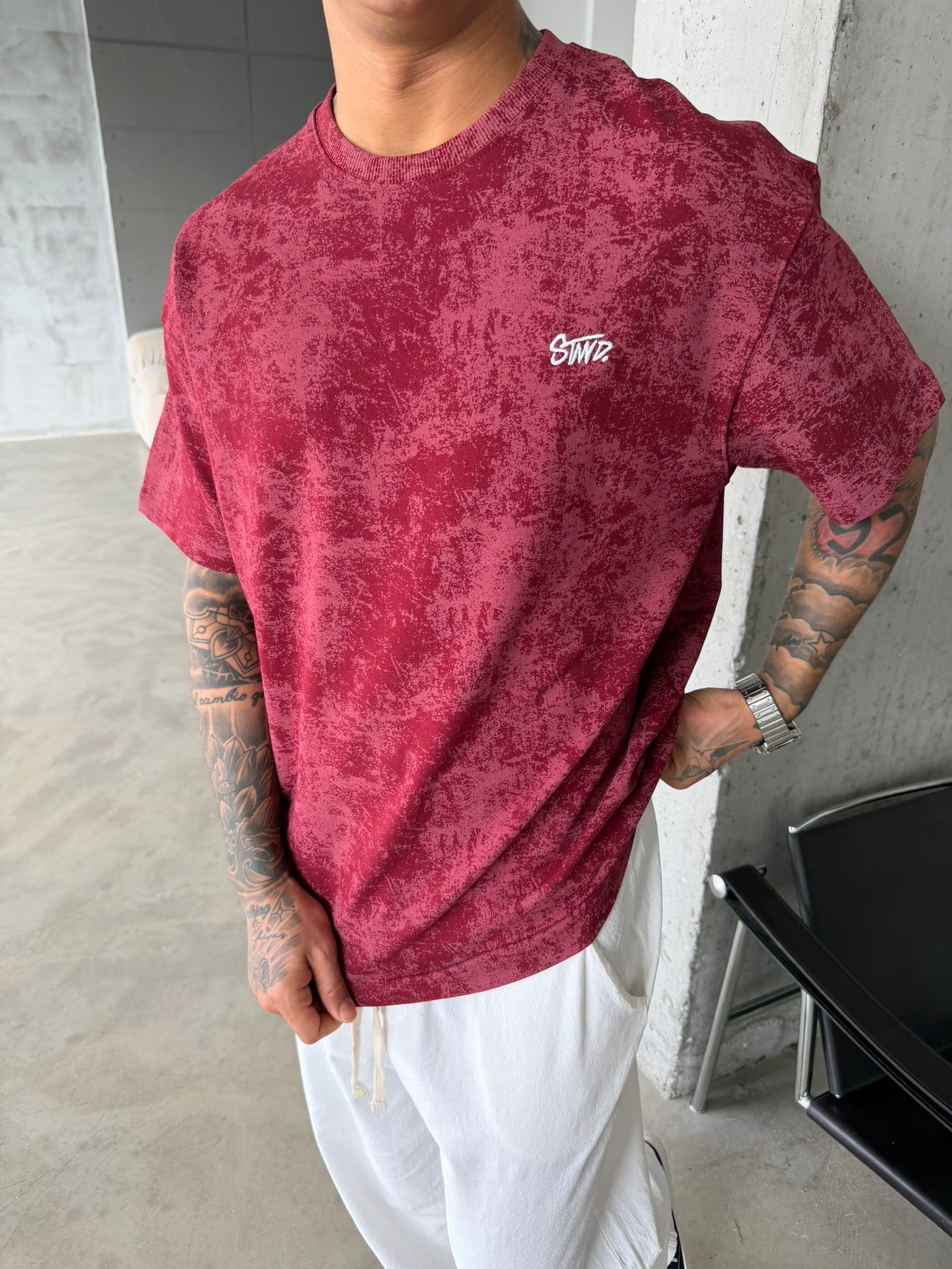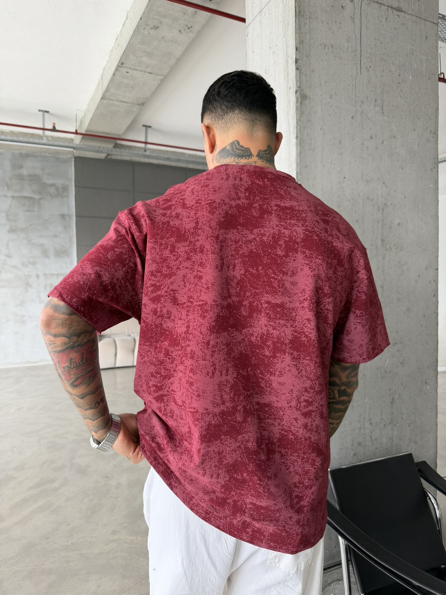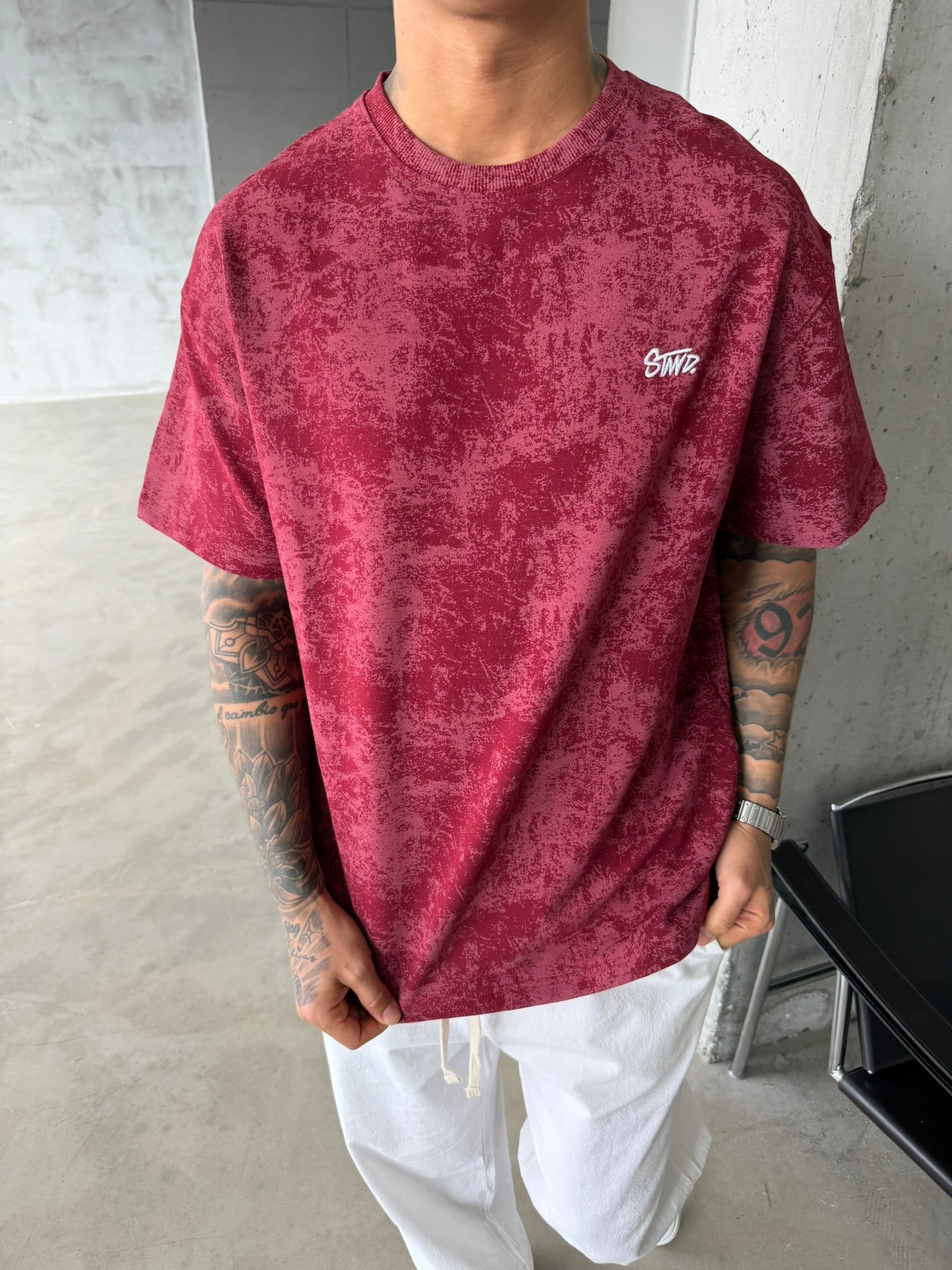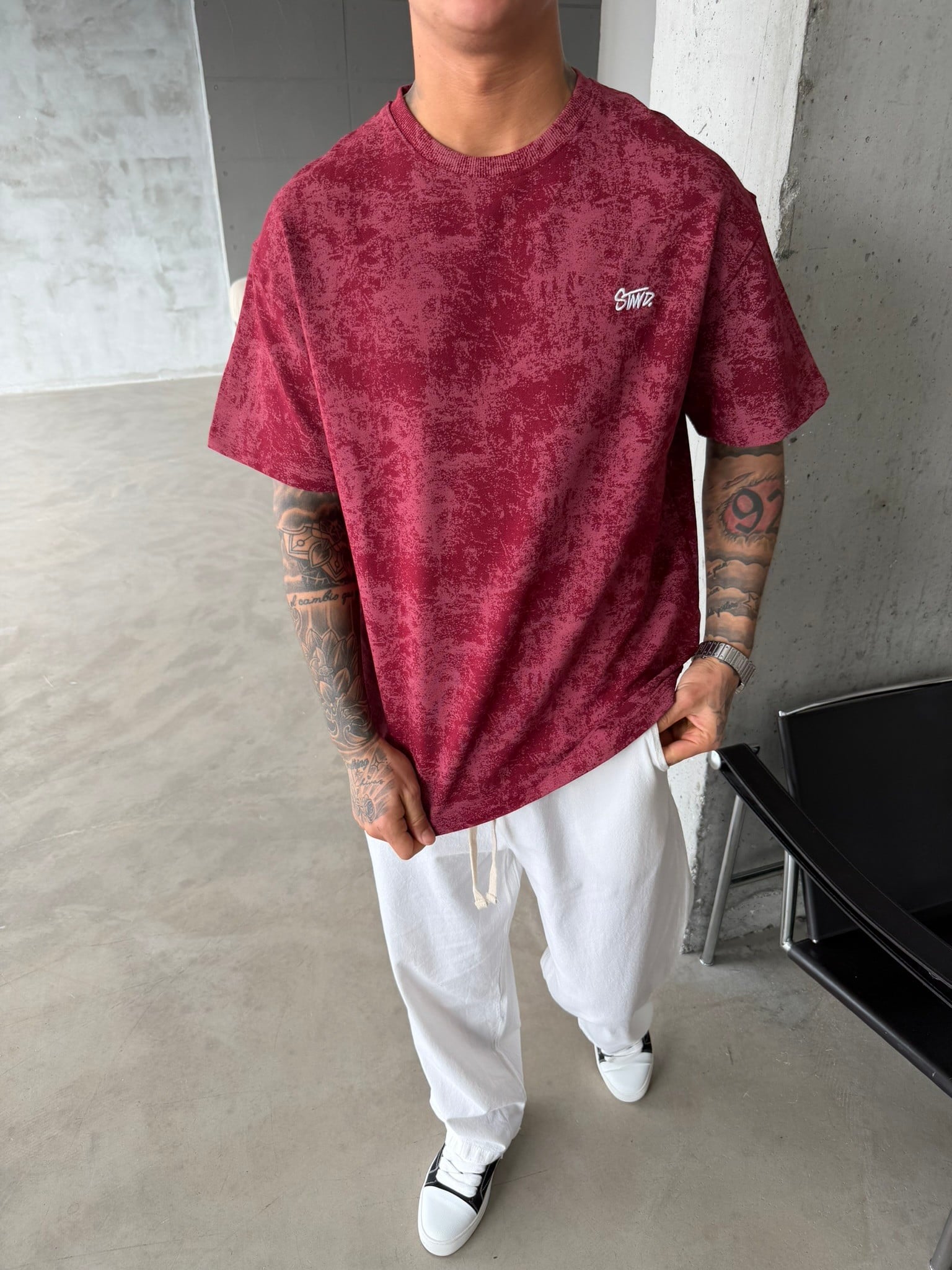 Yıkamalı Basic Nakışlı Acid T-Shirt - Bordo (TST.0136-Bordo-S)