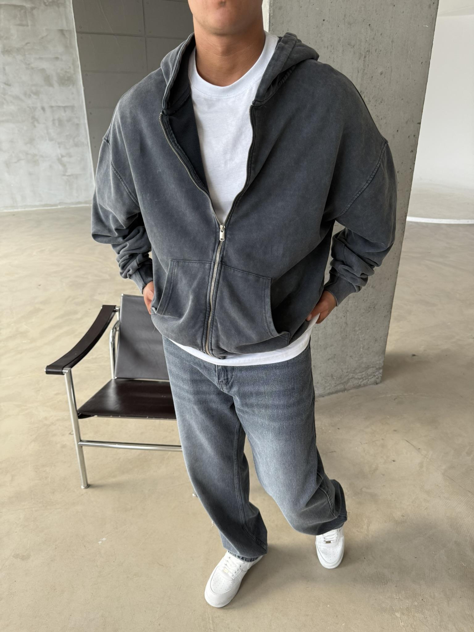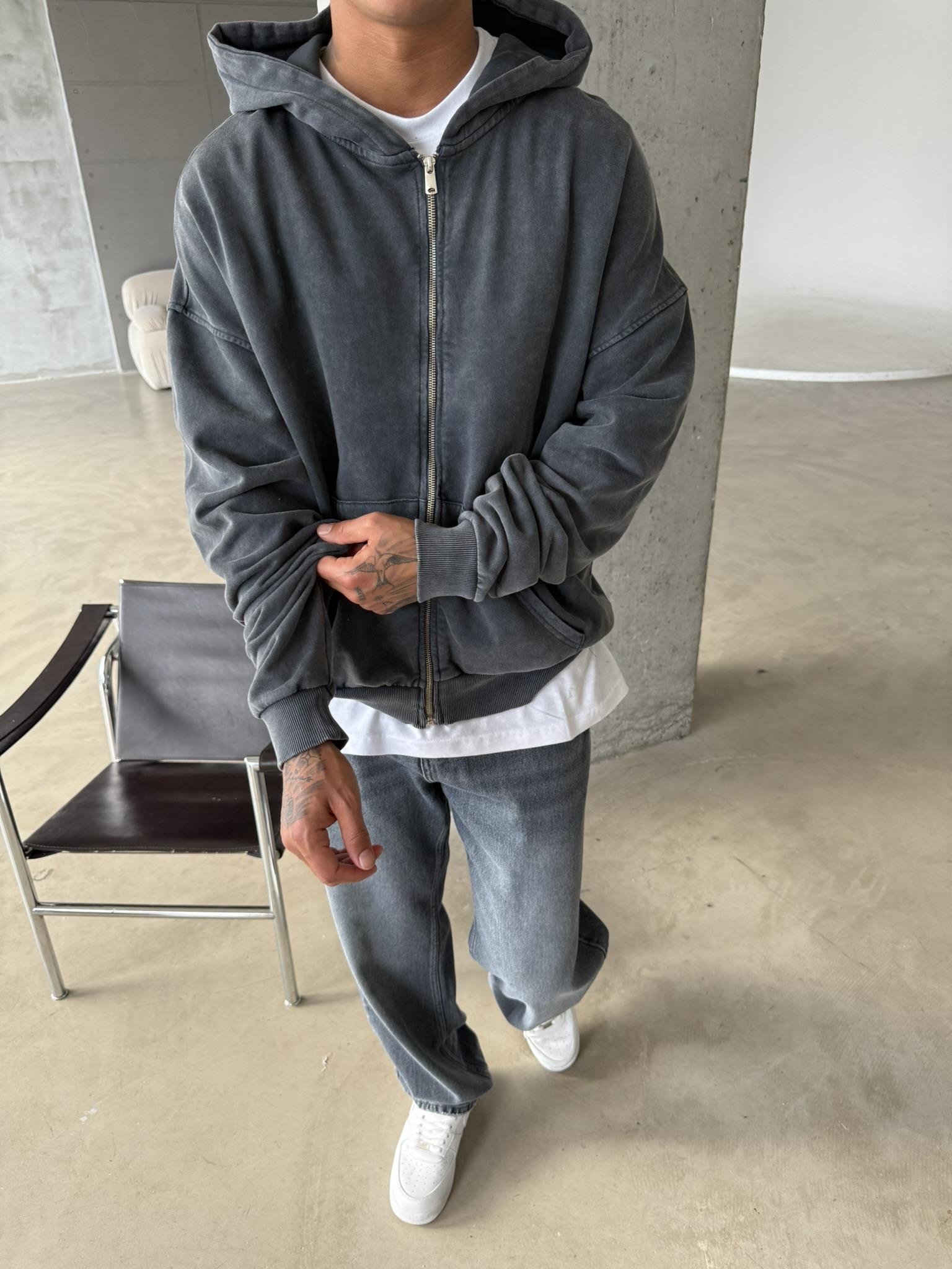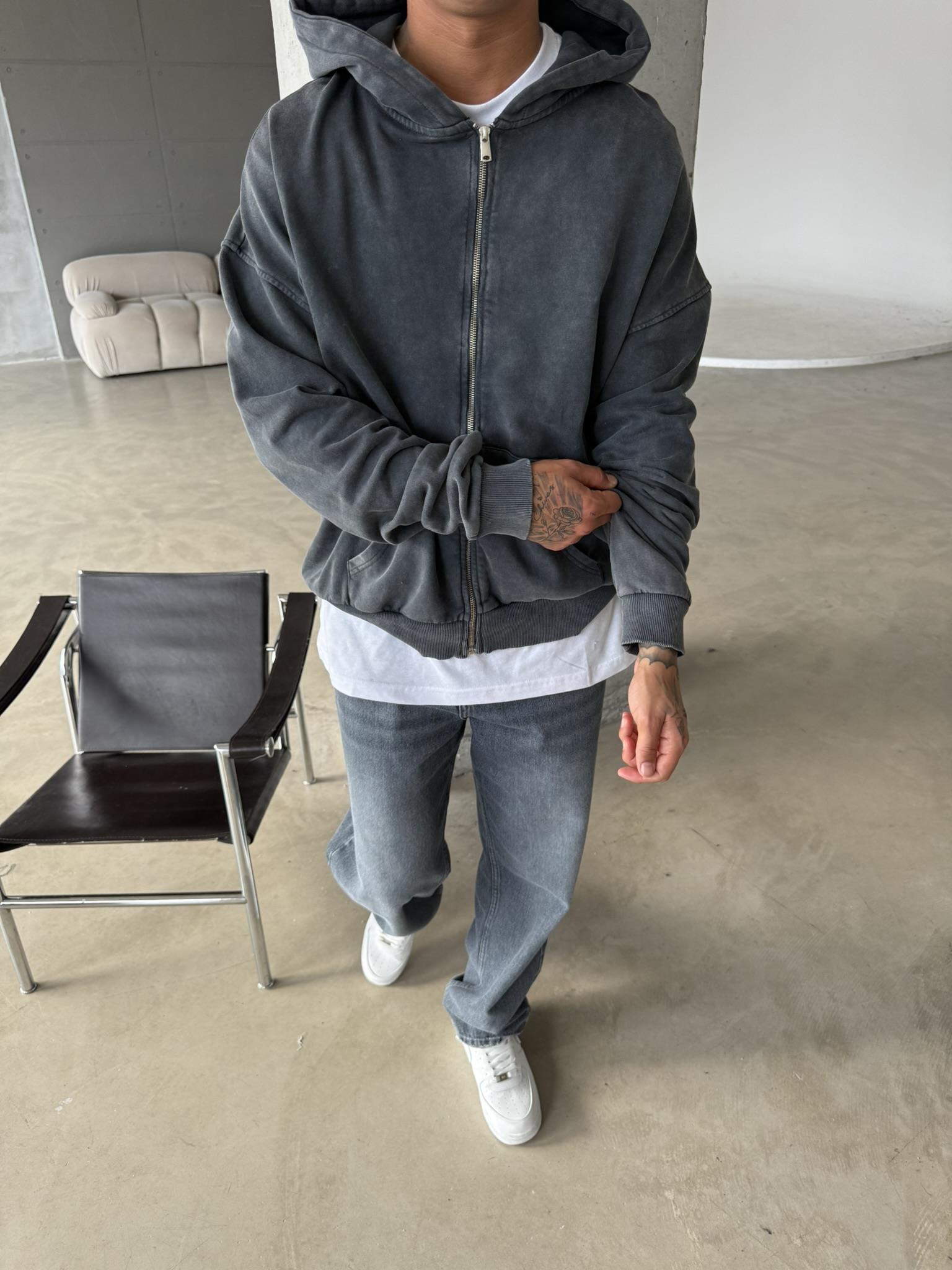 Yıkamalı Premium Acid Zip Hırka - Siyah (HRK.0002-Siyah-S)
