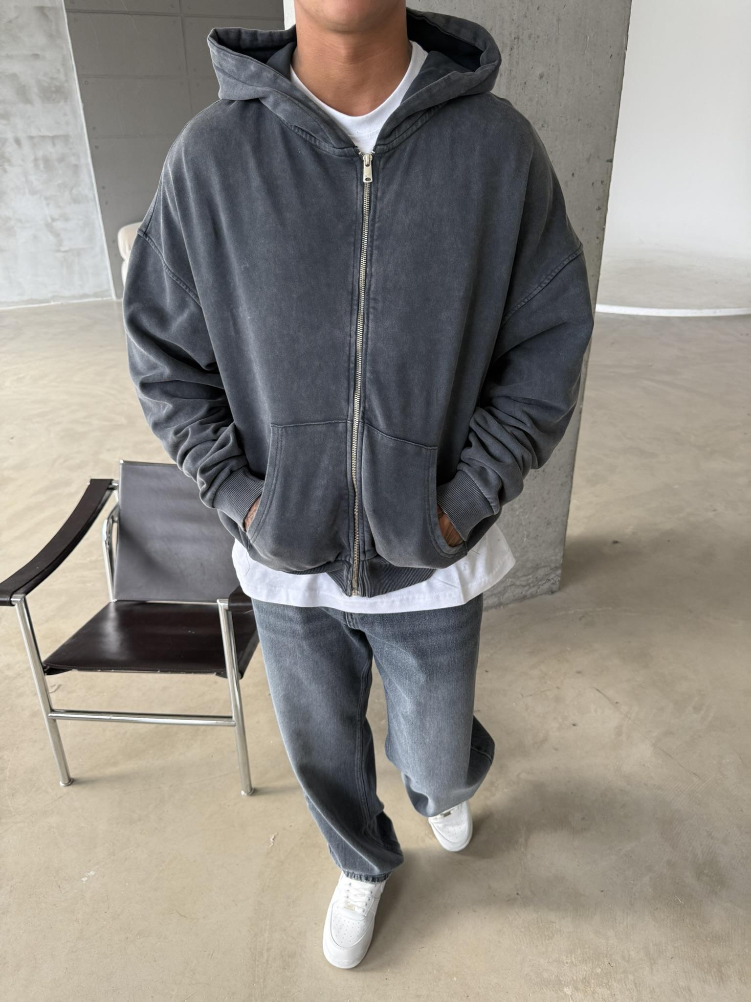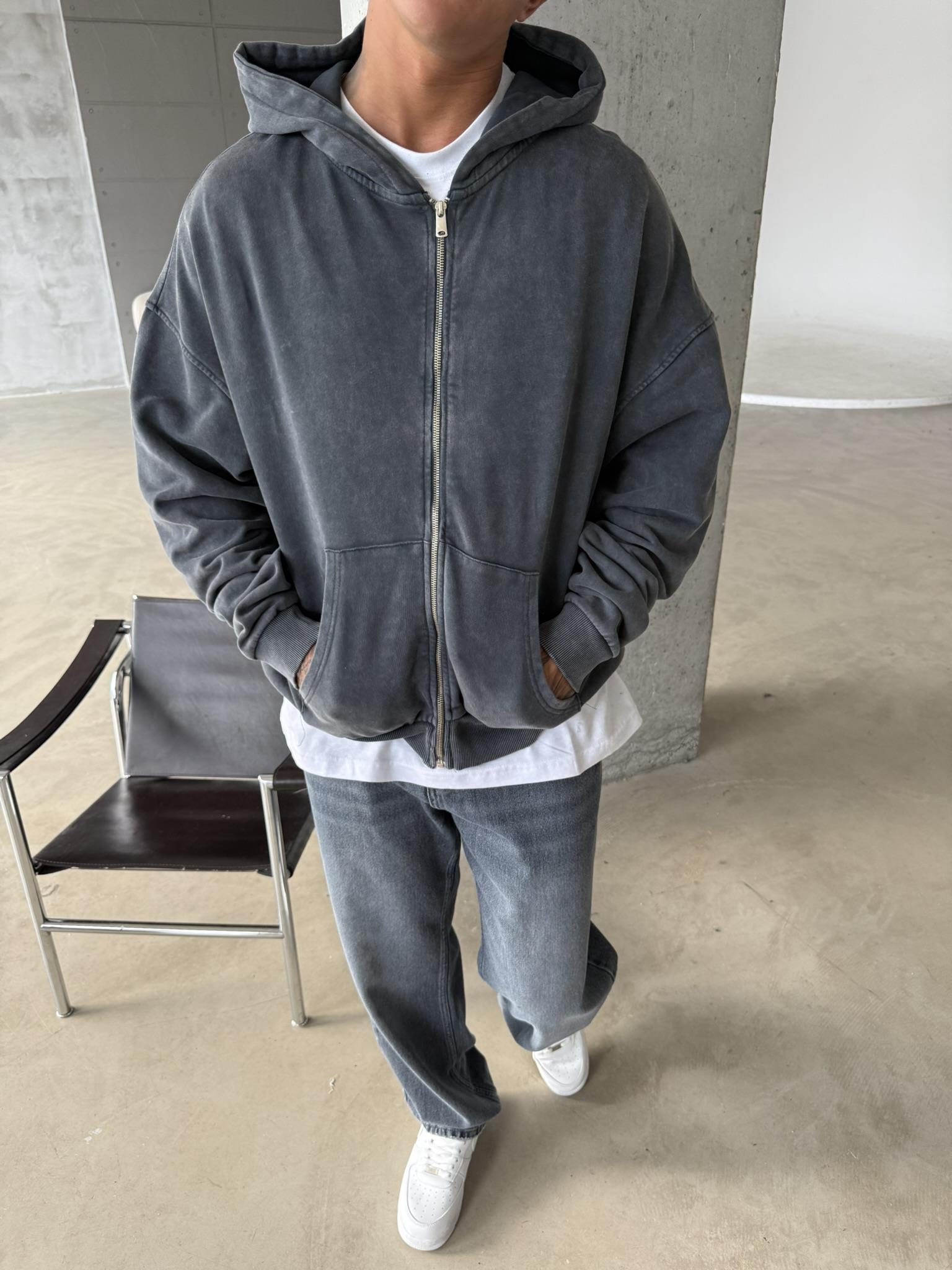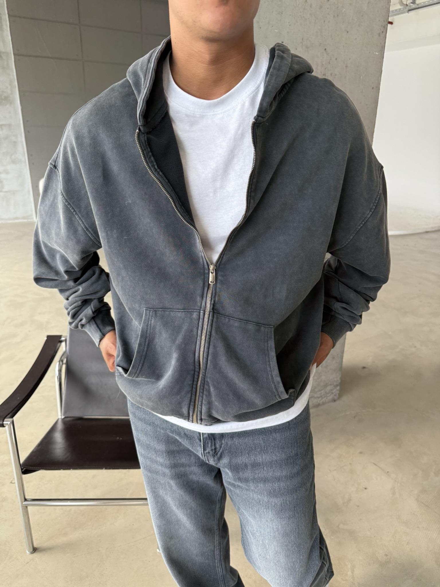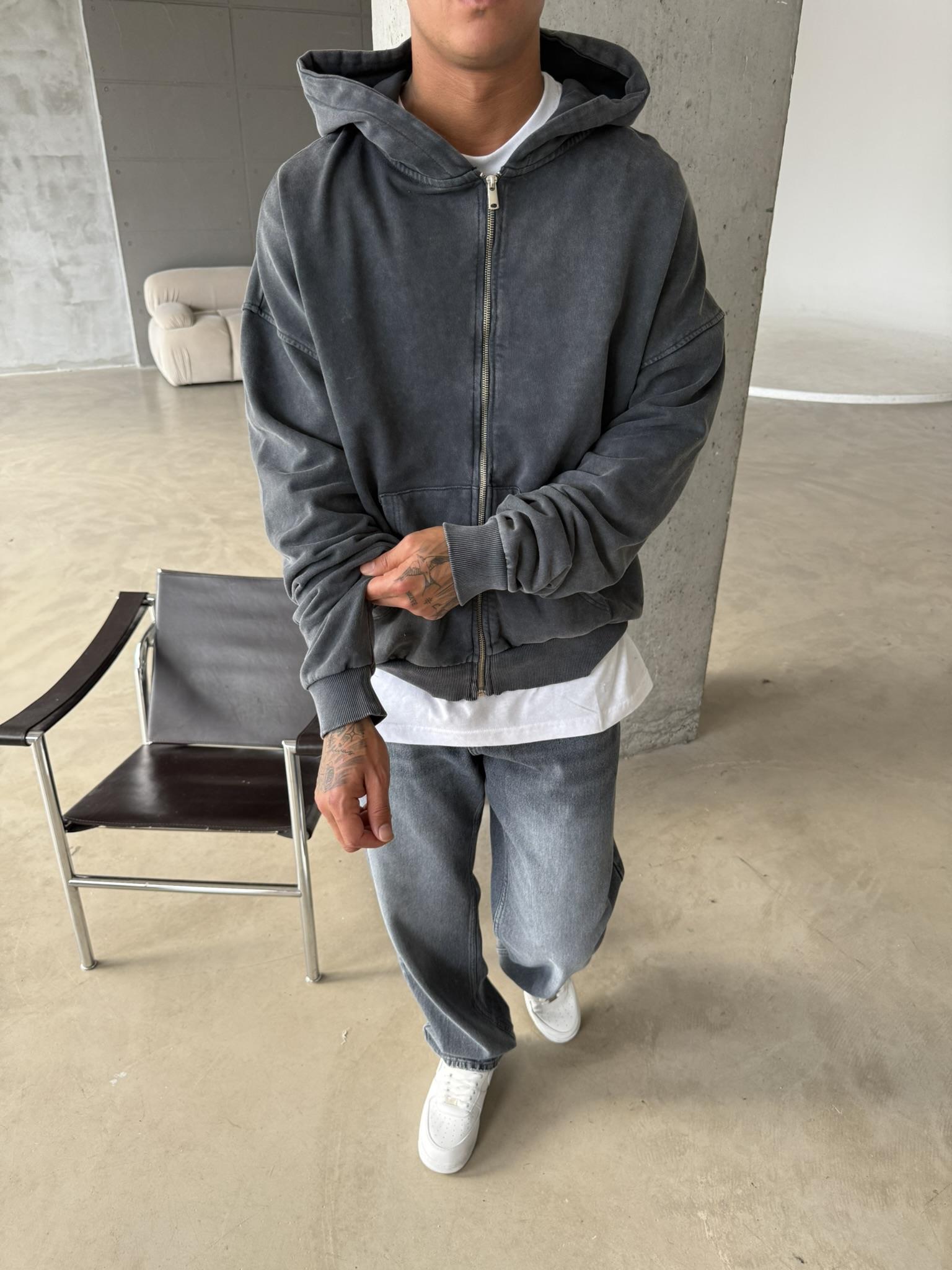 Yıkamalı Premium Acid Zip Hırka - Siyah (HRK.0002-Siyah-S)