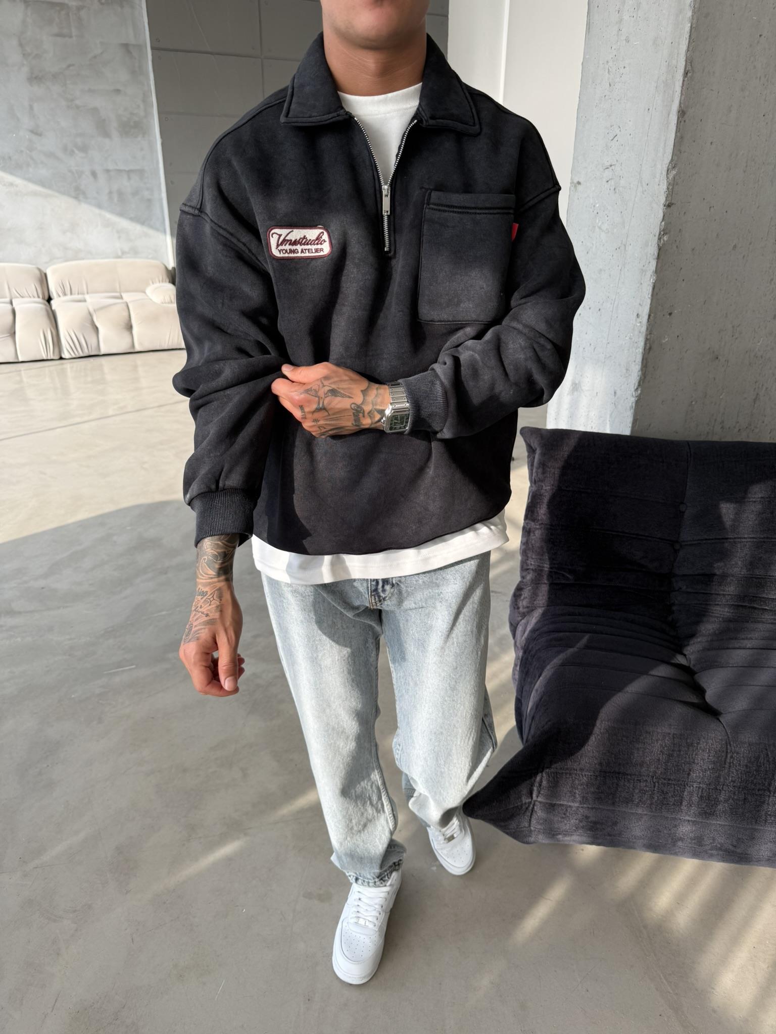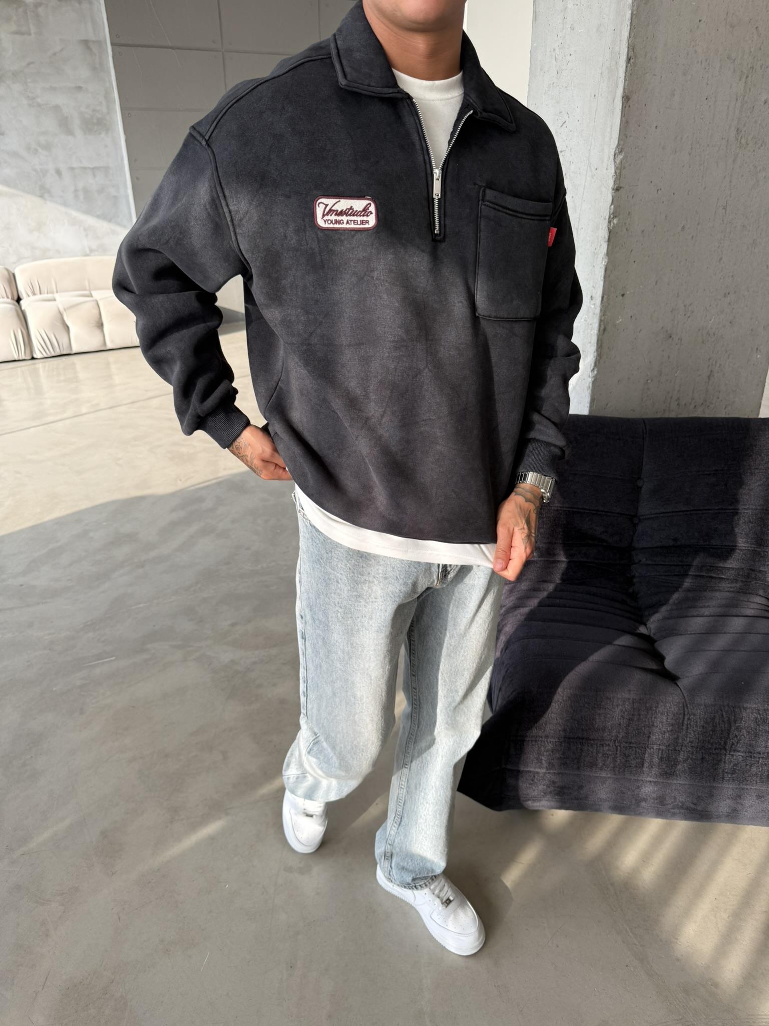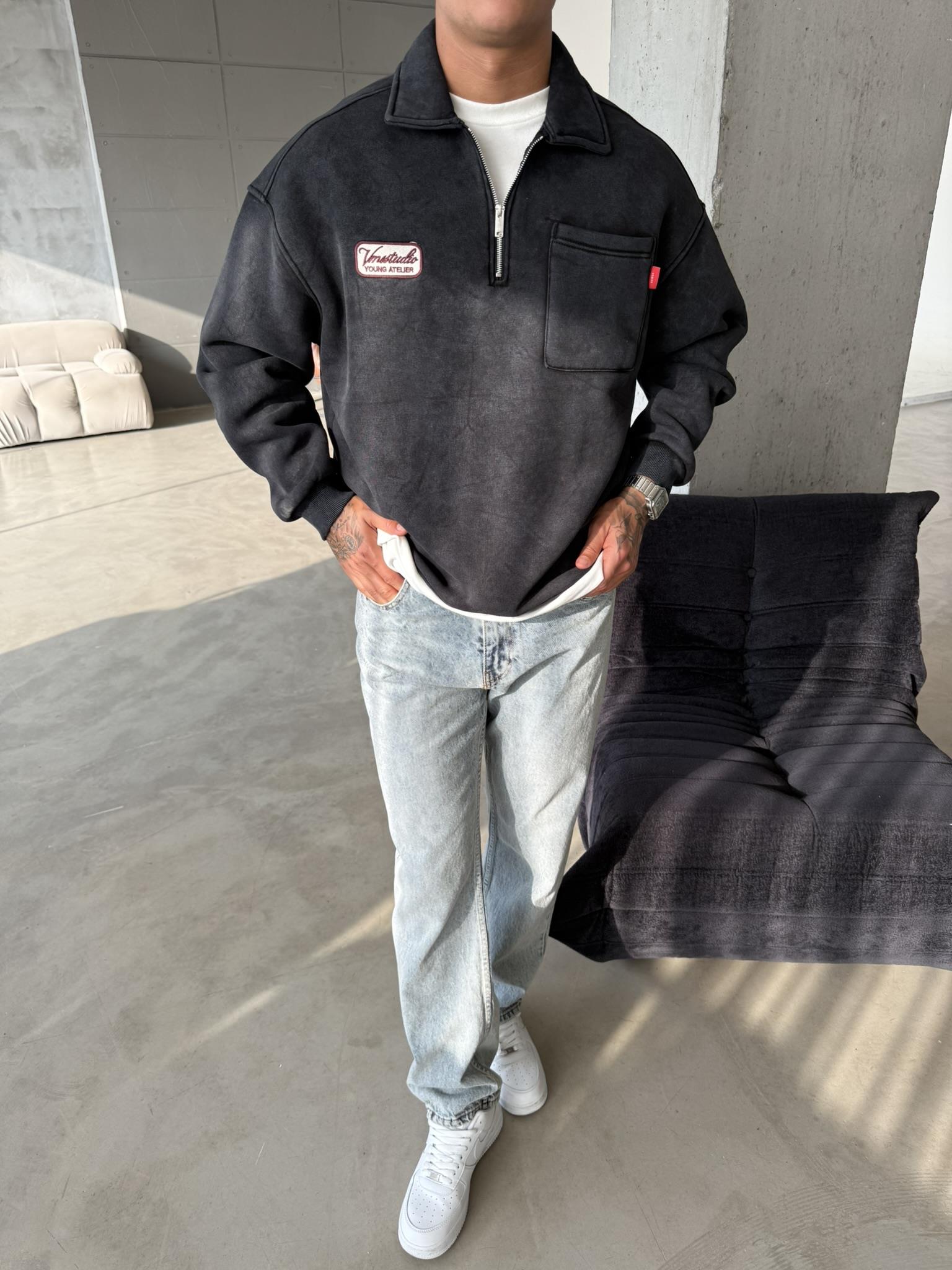 Yıkamalı Yarım Fermuar Young Atelier Sweat - Siyah (SWT.0037-Siyah-S)